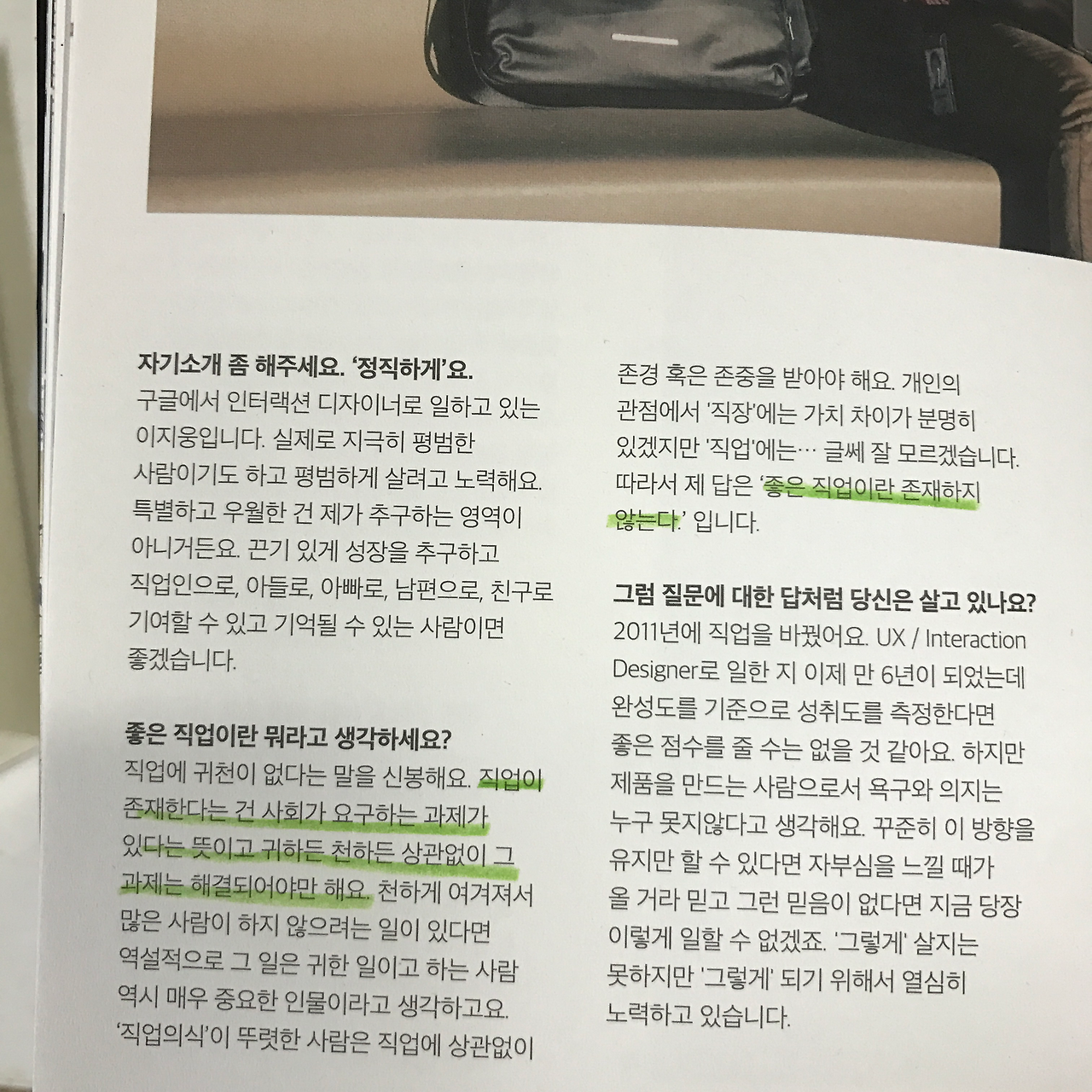 색연필로 쓱쓱 줄그어 가며 매거진 읽기는 난생 처음. 텍스트를 좀 더 꾹꾹 눌러가며 소화하고 싶었고, 사람들이 느낀점을 나도 고스란히 느끼고 싶었나보다. 더 오래 그 마음을 간직하기라도 하려는 것처럼.