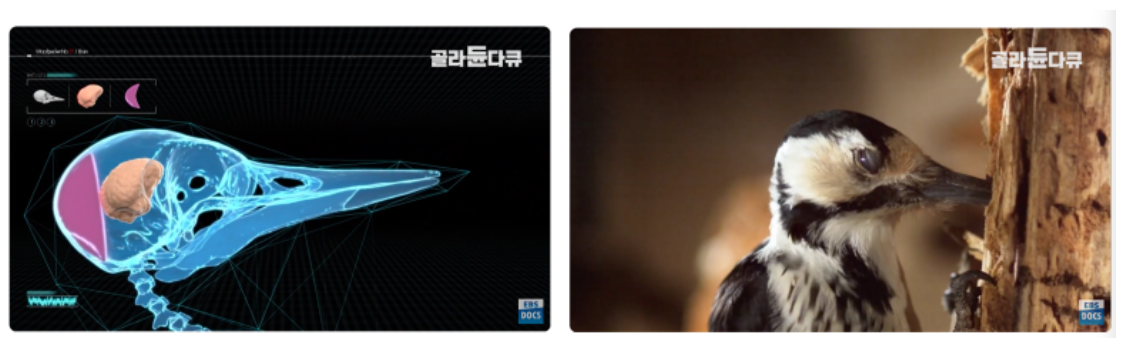 EBS의 다큐멘터리에서 엑스레이처럼 뇌의 내부 구조를 보여주며 친절히 설명했다. 나무를 두들길 때 딱따구리 머리가 받는 힘은 중력의 1000배나 된다고 한다. 뇌가 뒤로 밀리면 스펀지 같은 연골 쿠션이 충격을 흡수한다. 동시에 나무에 탁! 하고 부리가 닿을 때 이에 맞춰 눈을 감는다. 슬로모션으로 보니 정말 눈알이 튀어나오지 않게 반쯤 감는 모습을 포착할 수 있었다. 재채기할 때 사람이 자연스럽게 눈을 감는 것처럼 말이다. 스프링 역할을 하는 목 근육, 길이가 미세하게 달라 충격을 분산시키는 부리 뼈 등도 부리로 나무를 쪼기에 최적화되어 진화된 신체의 일부다. 여기에 발가락은 나무에 걸기 좋게 발달되어 있으며, 살짝 긴 꽁지깃은 지지대처럼 균형을 잡아 충격을 분산시킨다. 이미 2억 5천만 년 전부터 완성된 구조로 딱따구리가 살아왔으니 놀랍기만 하다.