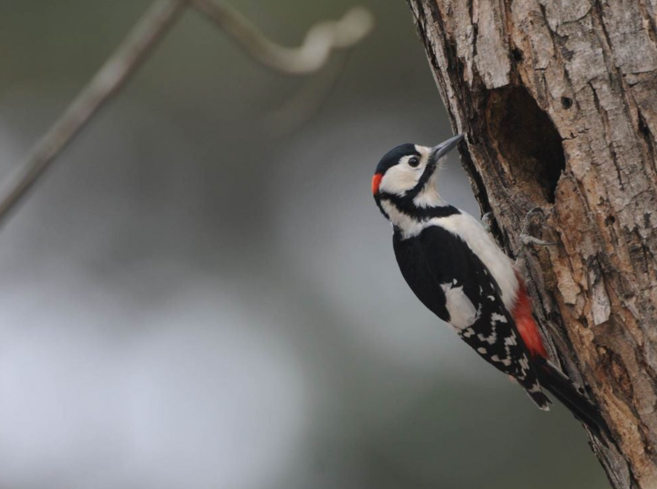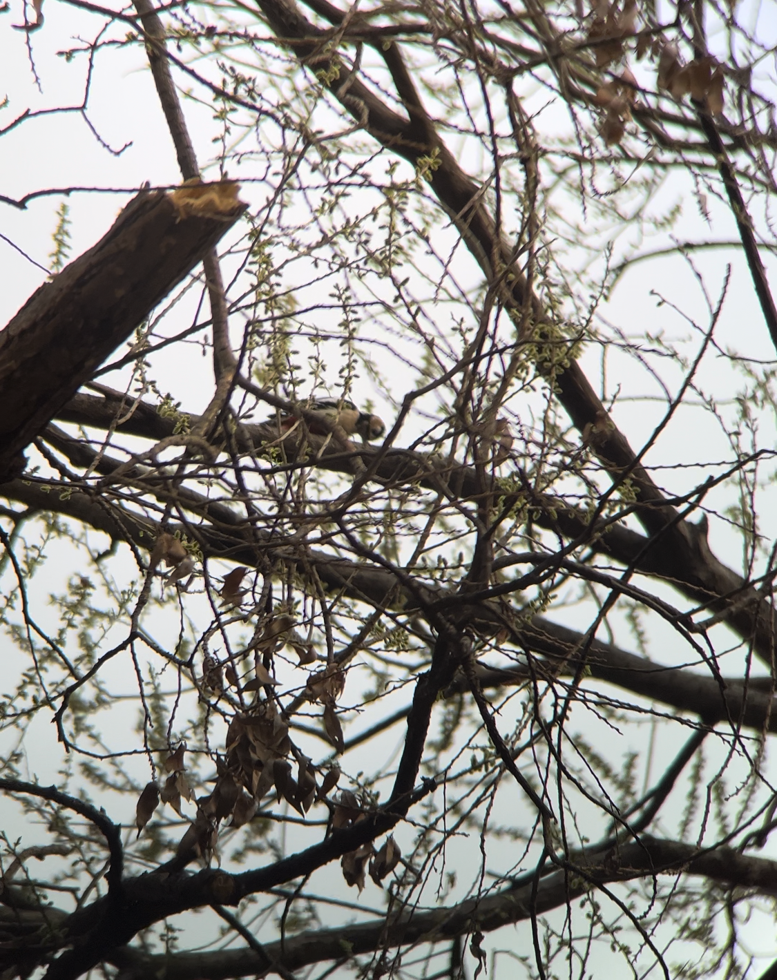딱따구리의 나무 쪼는 소리가 맞는데 도저히 찾을 수 없었다. 아직 잎이 무성하지 않아 빈 가지 틈으로 새를 발견하기 쉬운데도 찾기 어려웠다. 주의를 기울여 움직임이 조금이라도 있는 나무를 향해 고개를 돌렸다. 배에 빨간색이 보인다. 오색딱따구리다!