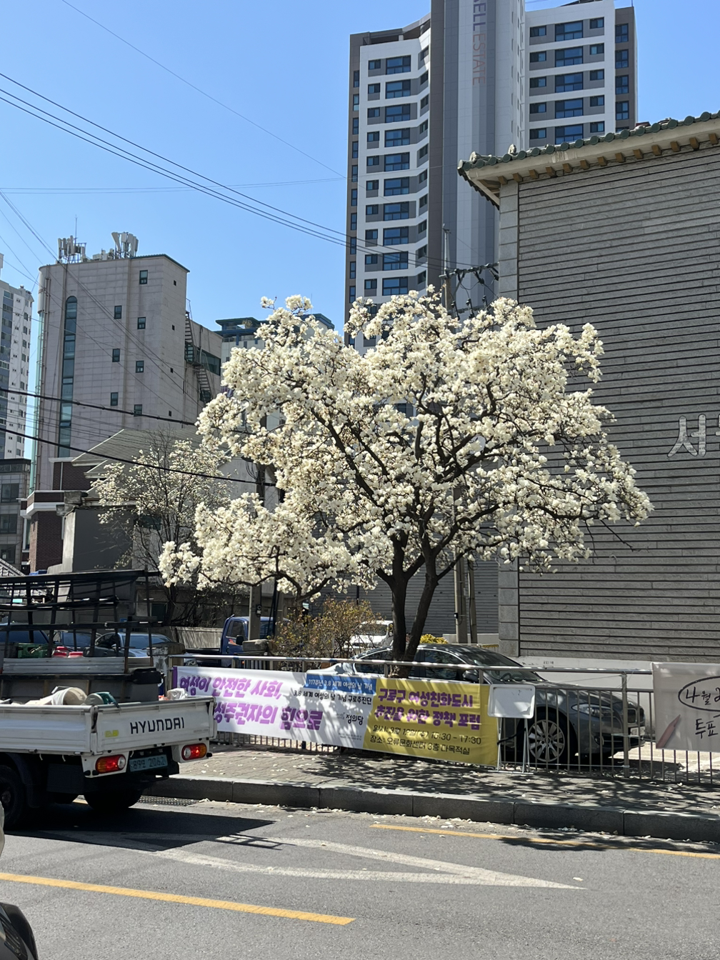 길가에 조명을 켠 것처럼 목련 나무를 중심으로 환해진다. 워낙 꽃잎이 크고 하얘서 주변부까지 밝게 만든다. 평소 같으면 그냥 지나칠 거리인데, 목련 하나 때문에 사람들은 가던 발걸음을 멈추고 핸드폰을 꺼내 사진을 부랴부랴 찍는다. "아, 진짜 예쁘다!" 나도 모르게 감탄사가 튀어나온다. 지나가던 아주머니도 그랬다.