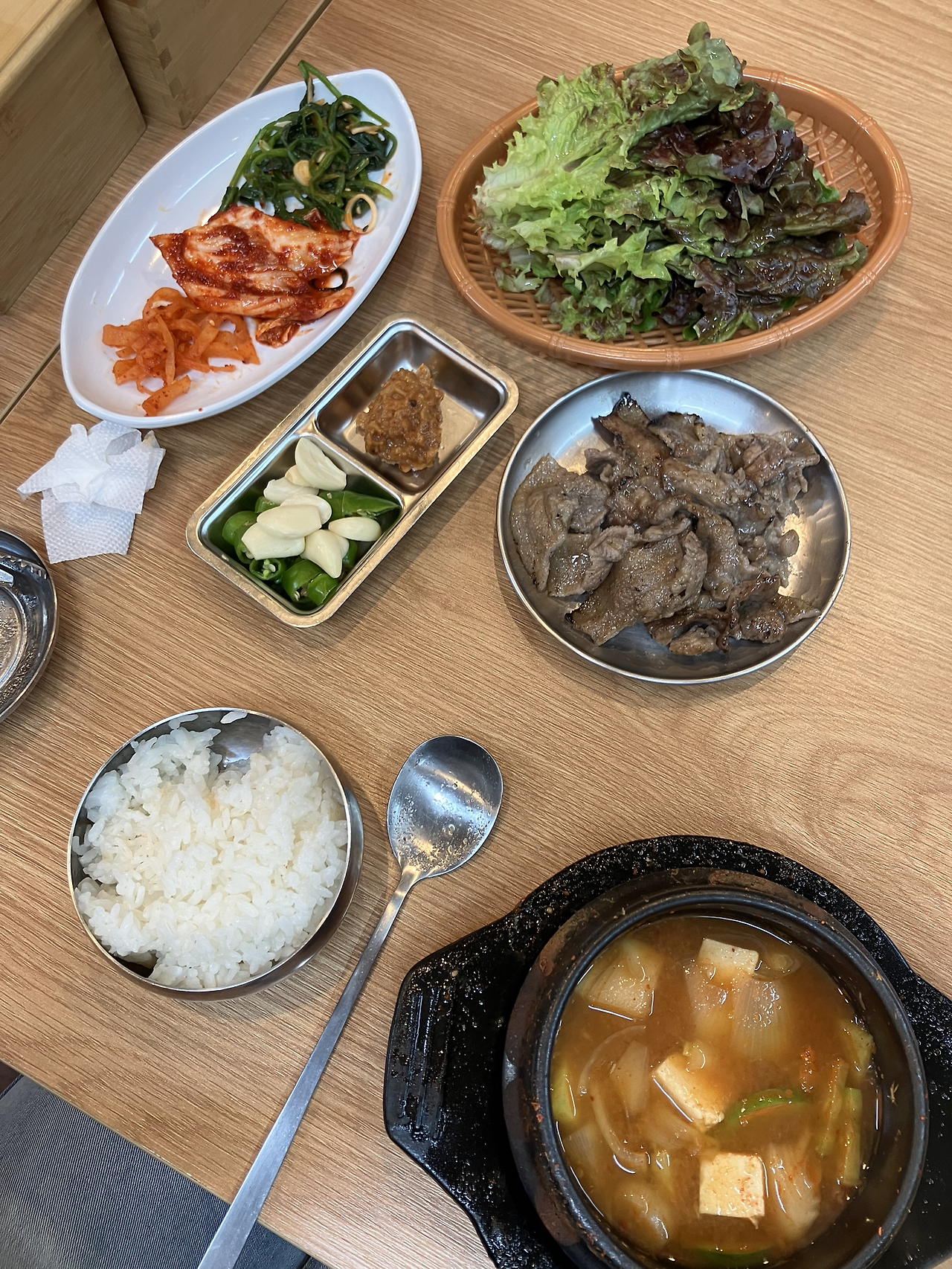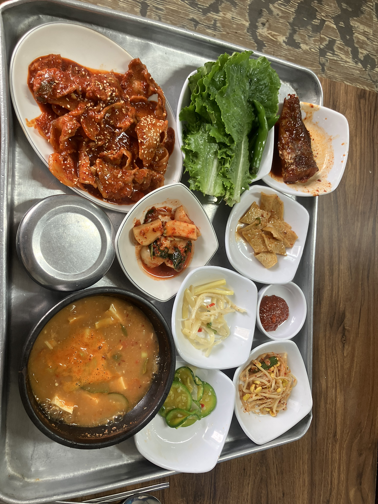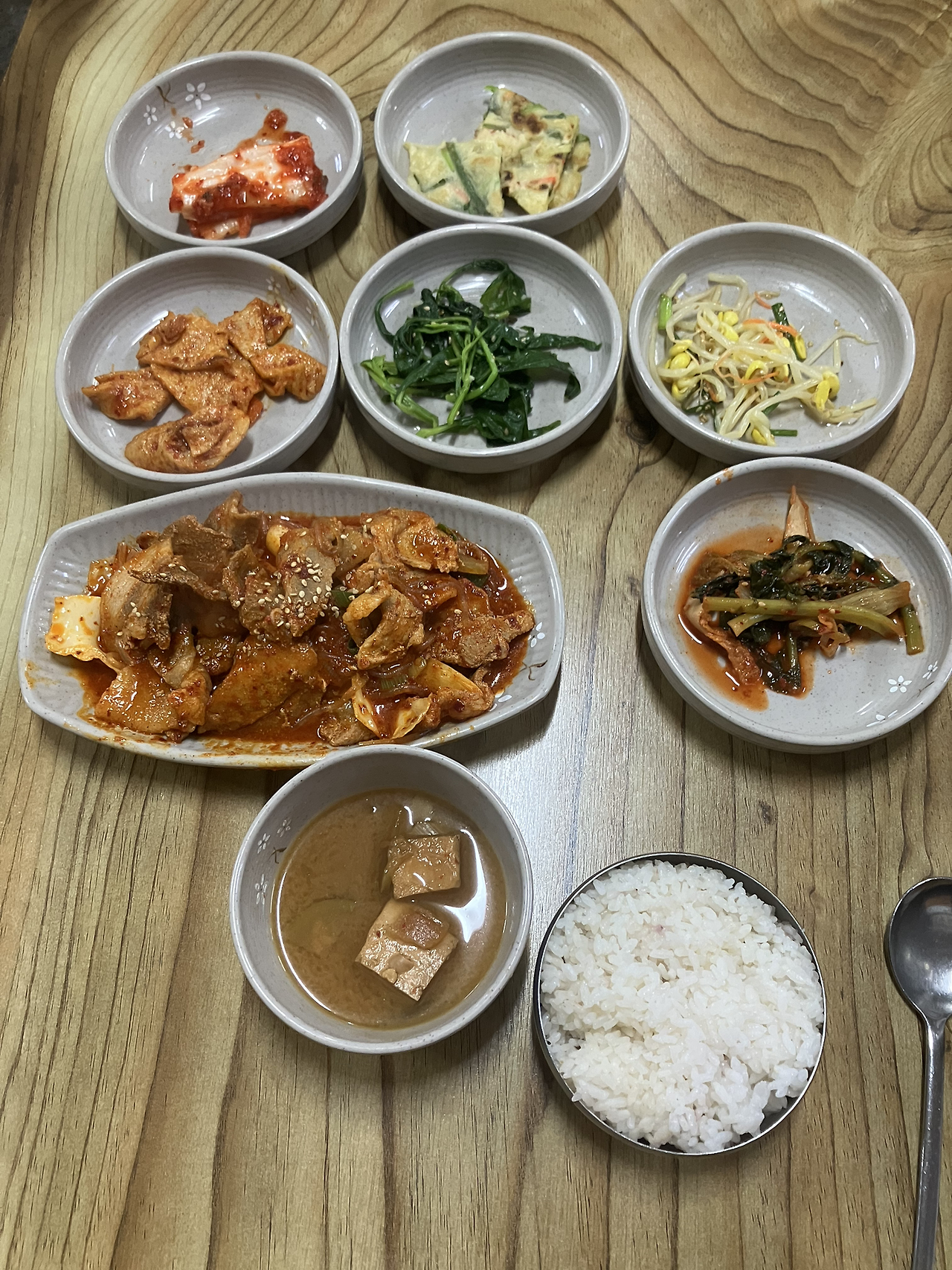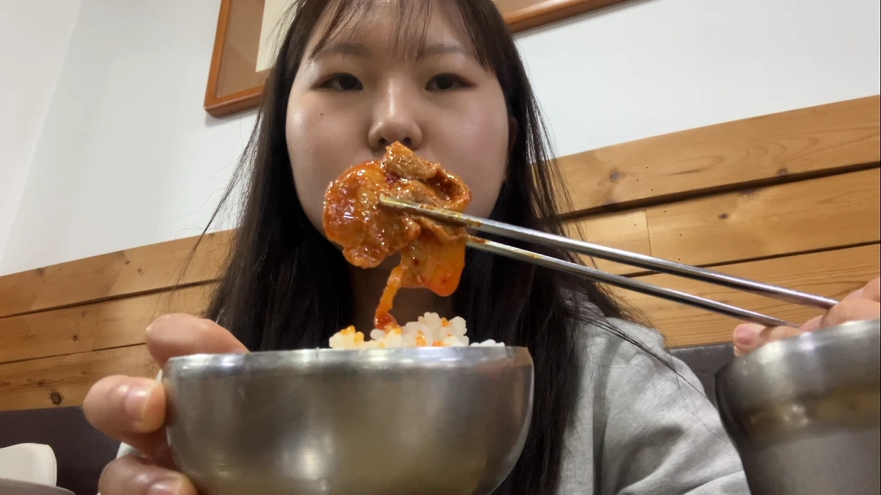 수업 끝나고 할 일하러 가기 전에, 강의실 근처, 손님은 늘 많음, 검은 우산은 바닥에 내려놓았고, 정갈히 놓인 그릇들, 제육볶음에 들어가 있는 떡, 다른 손님들은 생선구이와 돌솥비빔밥 주문