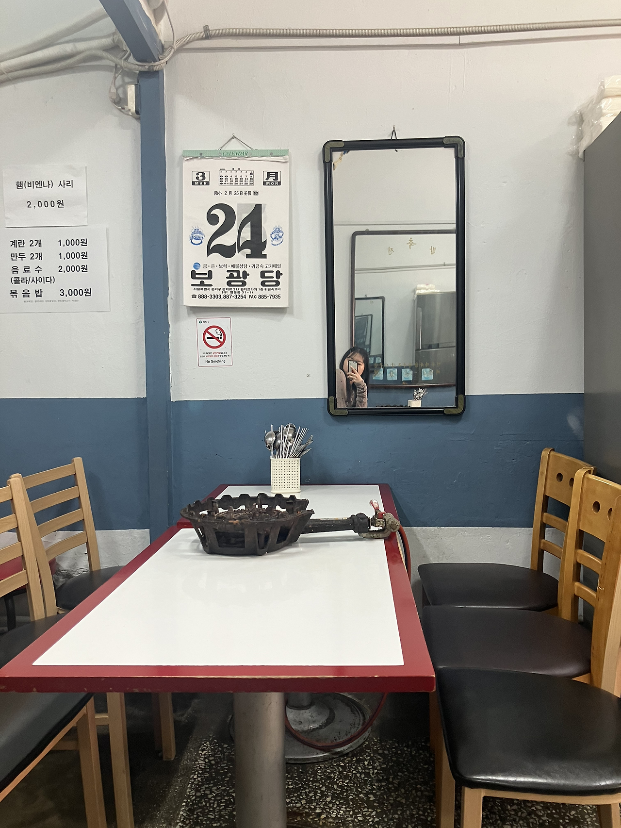 삼삼한 재미도 느낄 수 있다. 가게 사장님이 요리하는 모습, 식재료 다듬는 소리, 사장님과 직원의 대화, 다른 테이블 손님들의 말소리, 그 사람들은 어떤 메뉴를 골랐지? 힐끗 구경도 하고. 한쪽 구석 자리한 TV에서 나오는 뉴스와 예능 같은 것들. 가지각색의 식기와, 벽에 걸린 은행 달력이나 시계, 거울의 모양과 위치, 메뉴판 디자인 등. 누군가의 취향이 듬뿍 담긴 공간을 음미하는 건 꽤 흥미롭다.