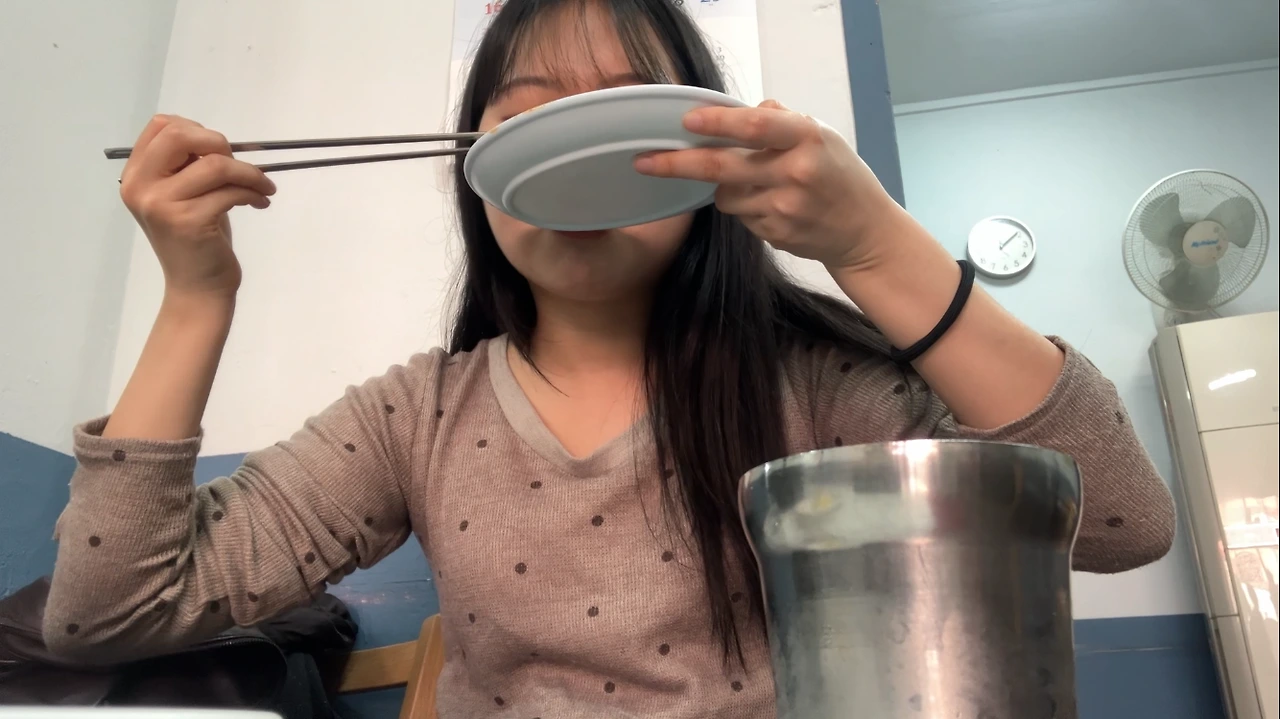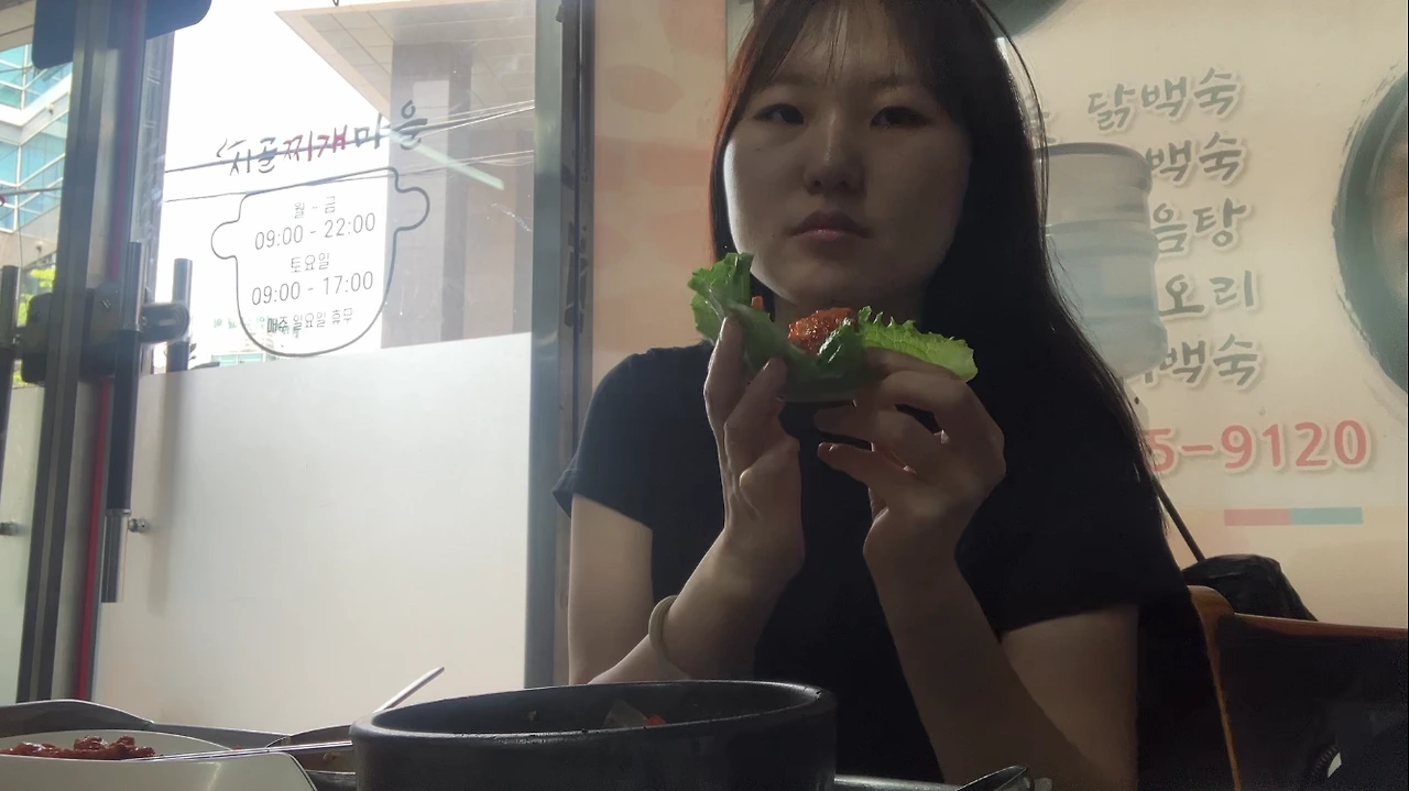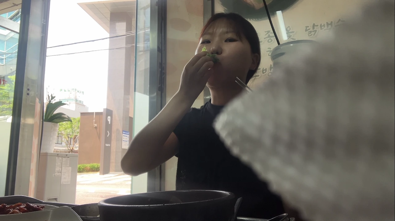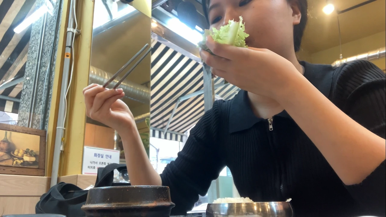 빈티지 쇼핑하고 나서, 손님은 나 혼자, 사장님이 여럿 계셨고 연세가 있어 보이셨음, 그래서 반찬도 셀프로 가져다 먹었음, 잘 먹으니까 히든 반찬(미역, 젓갈) 챙겨주신 사장님, 먹다 보니 내리는 비, 편의점에서 급하게 산 우산