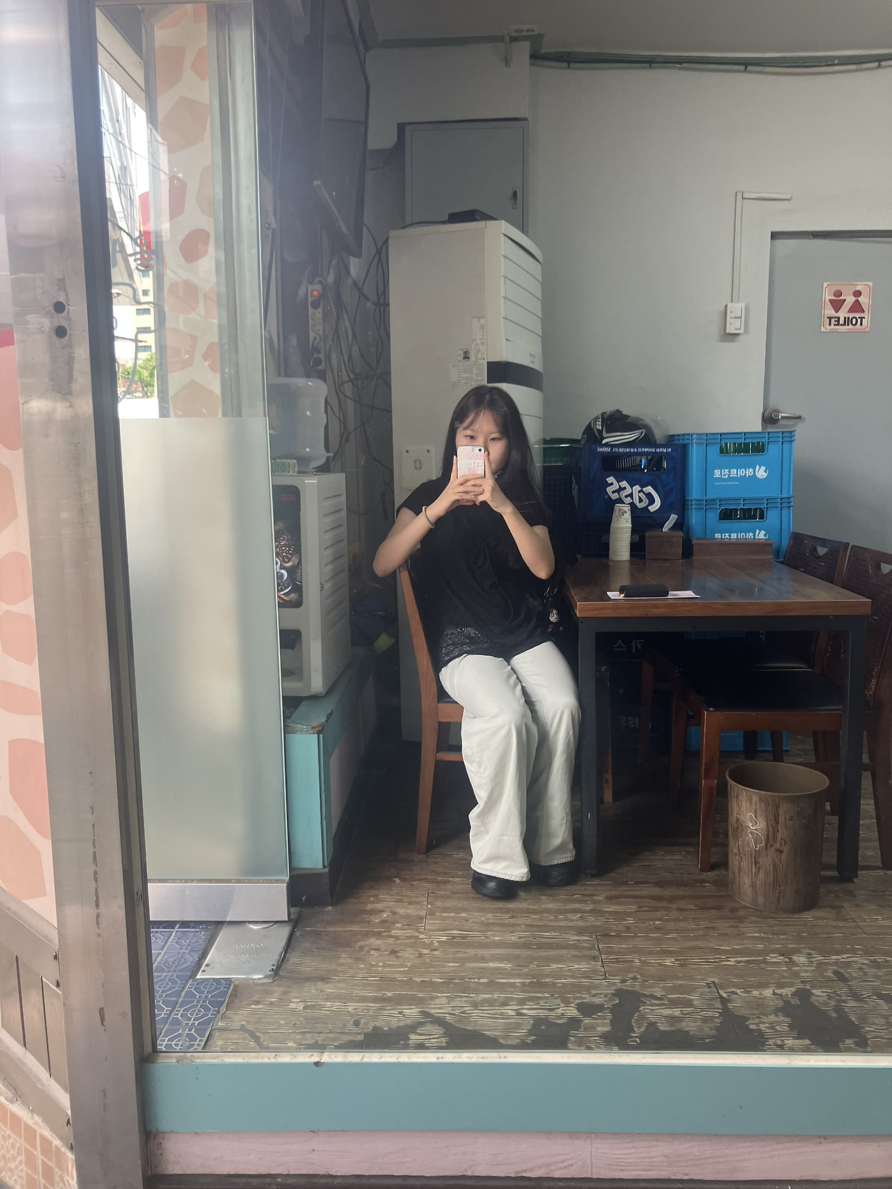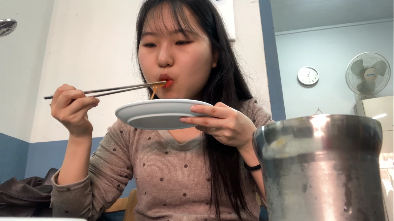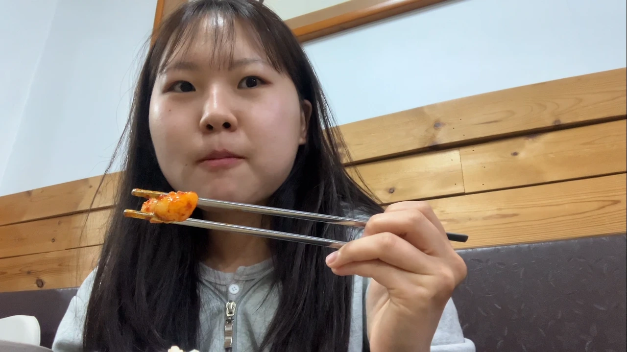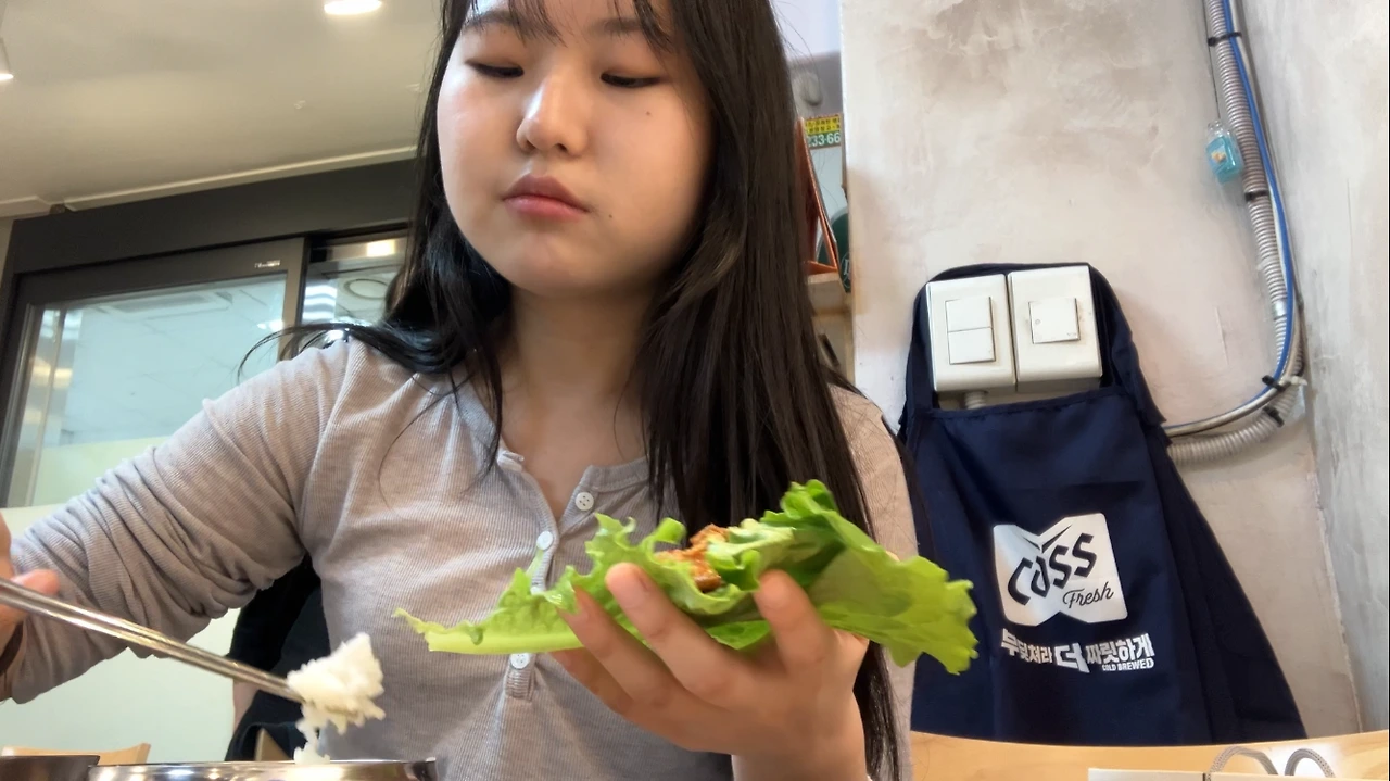 빈티지 쇼핑하고 나서, 손님은 나 혼자, 사장님이 여럿 계셨고 연세가 있어 보이셨음, 그래서 반찬도 셀프로 가져다 먹었음, 잘 먹으니까 히든 반찬(미역, 젓갈) 챙겨주신 사장님, 먹다 보니 내리는 비, 편의점에서 급하게 산 우산