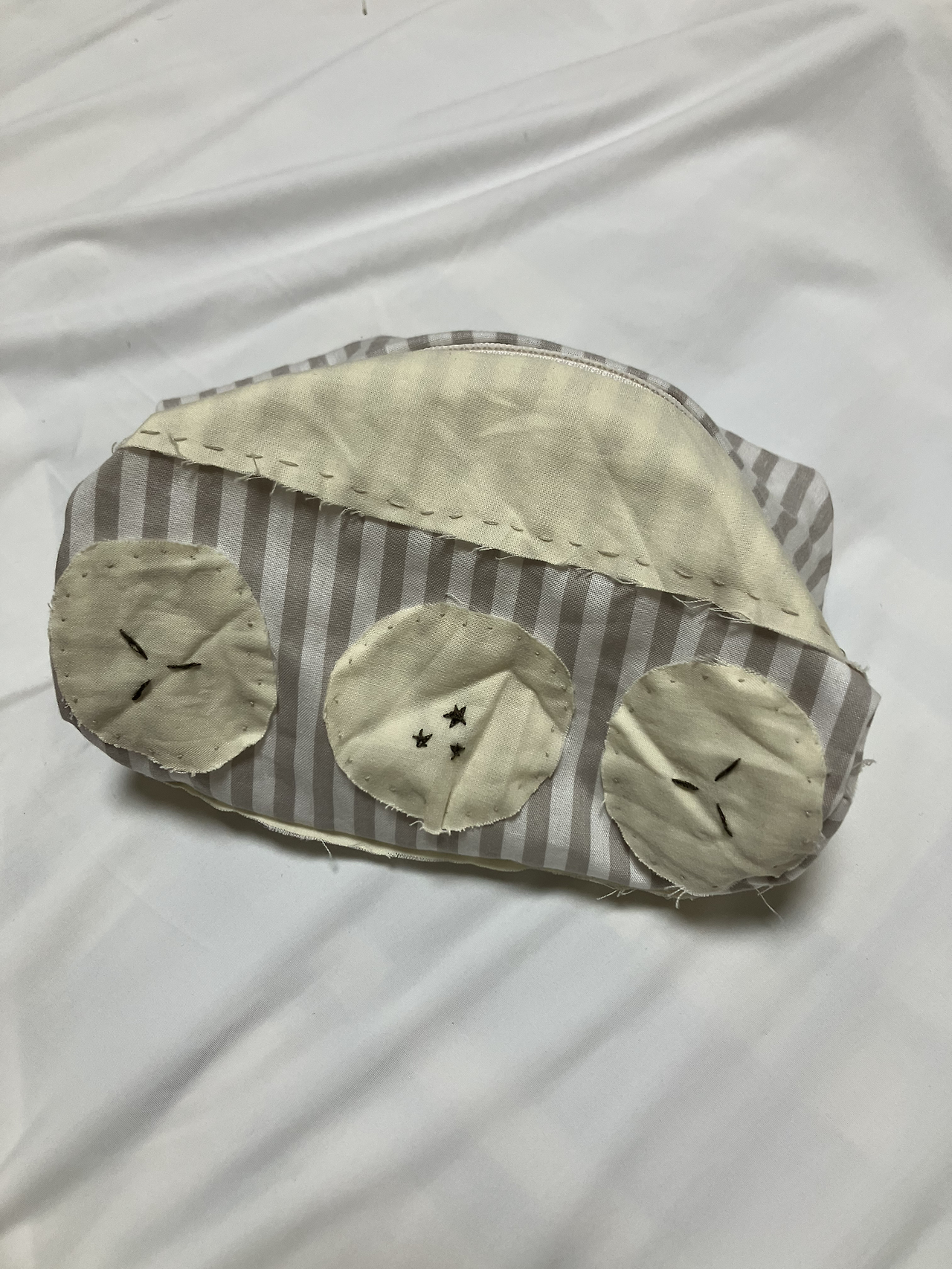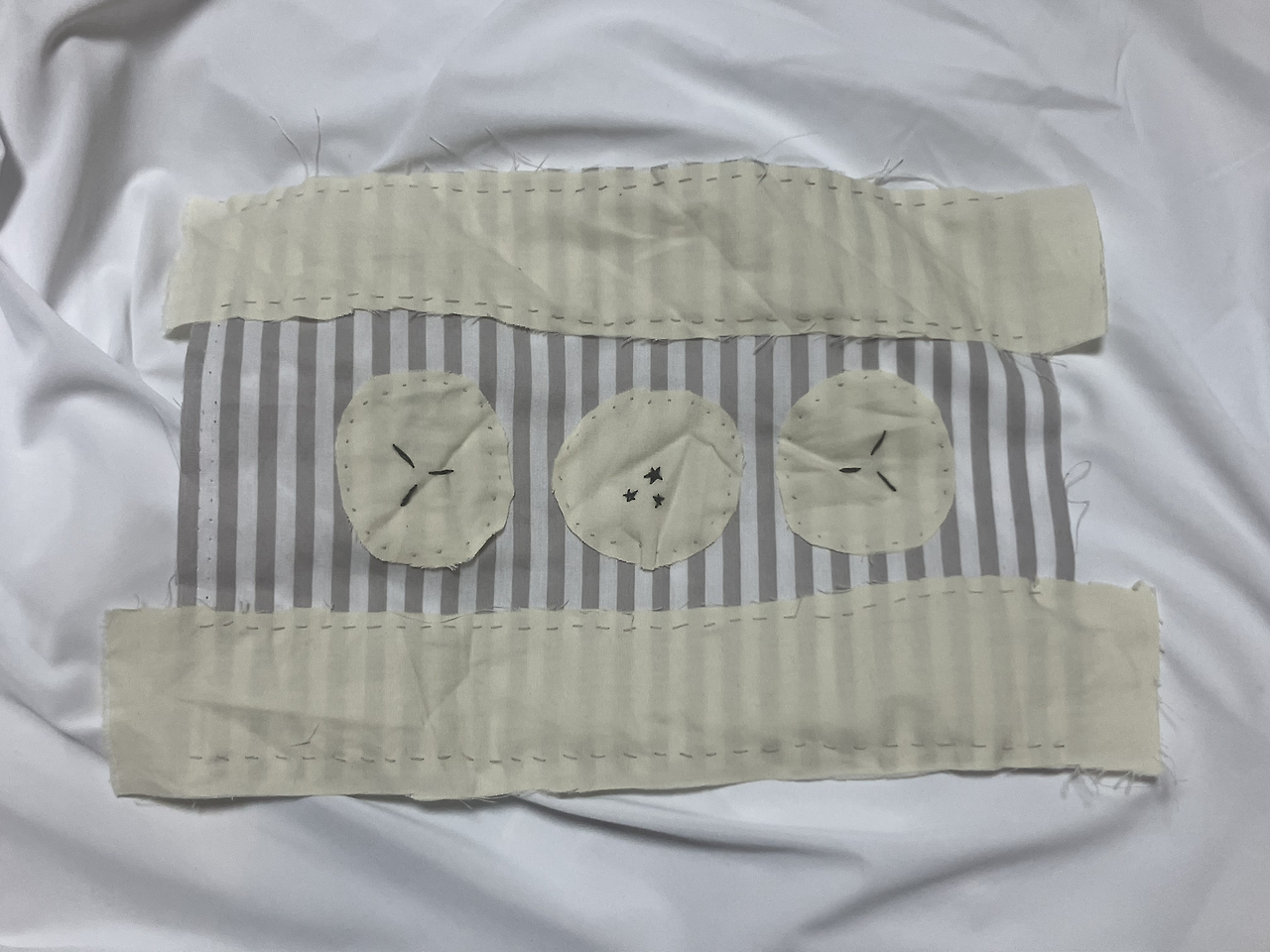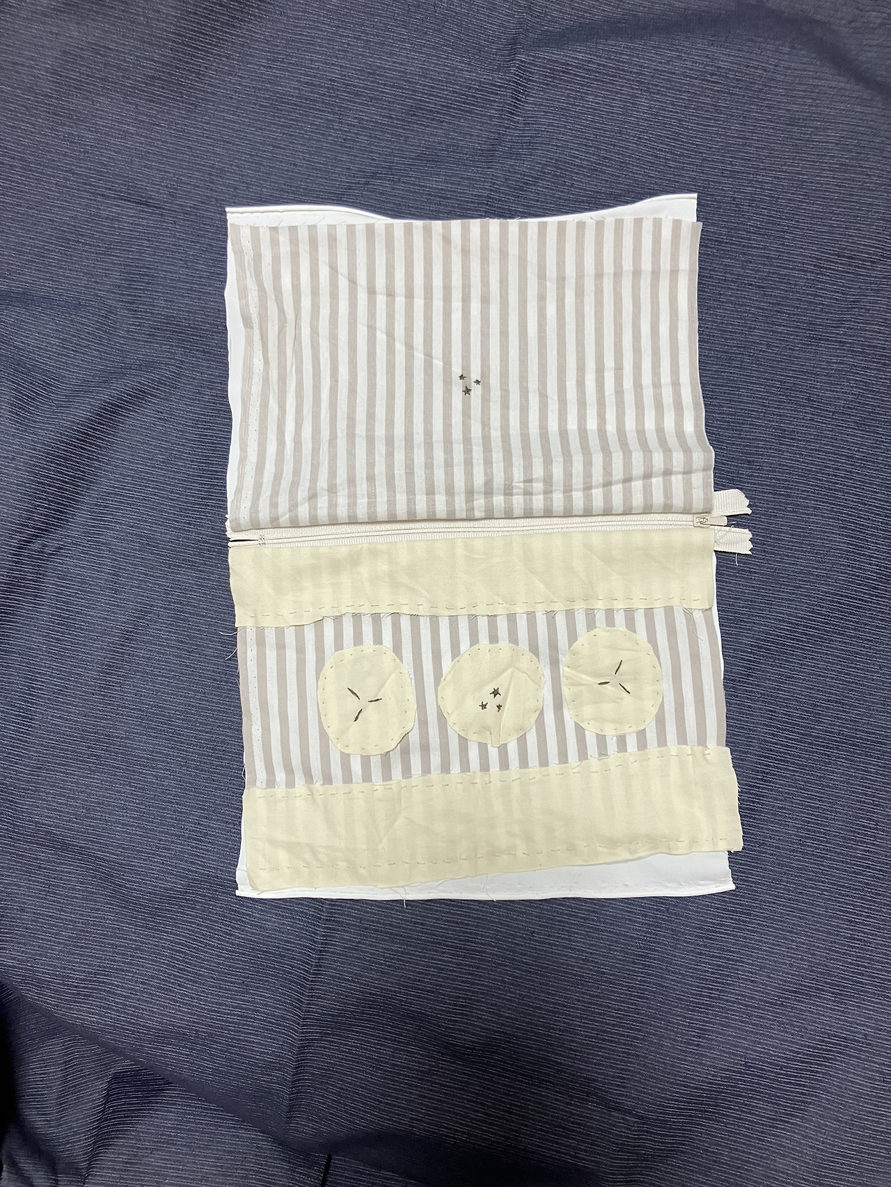 뒷면 디자인은 언니에게 조언을 구했다. 원래는 앞면과 똑같이 위아래로 식빵을 붙여줄 계획이었는데, 언니는 그냥 스트라이프 천 하나로 충분할 것 같다고 했다. 언니 말에 설득당했고, 바나나에 새긴 미니 별 자수만 그대로 가져와 뒷면을 마무리했다. 꽤 마음에 든다.