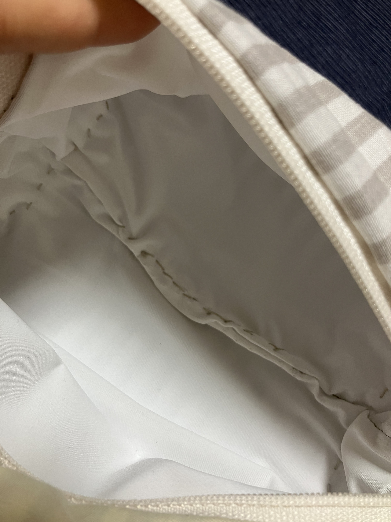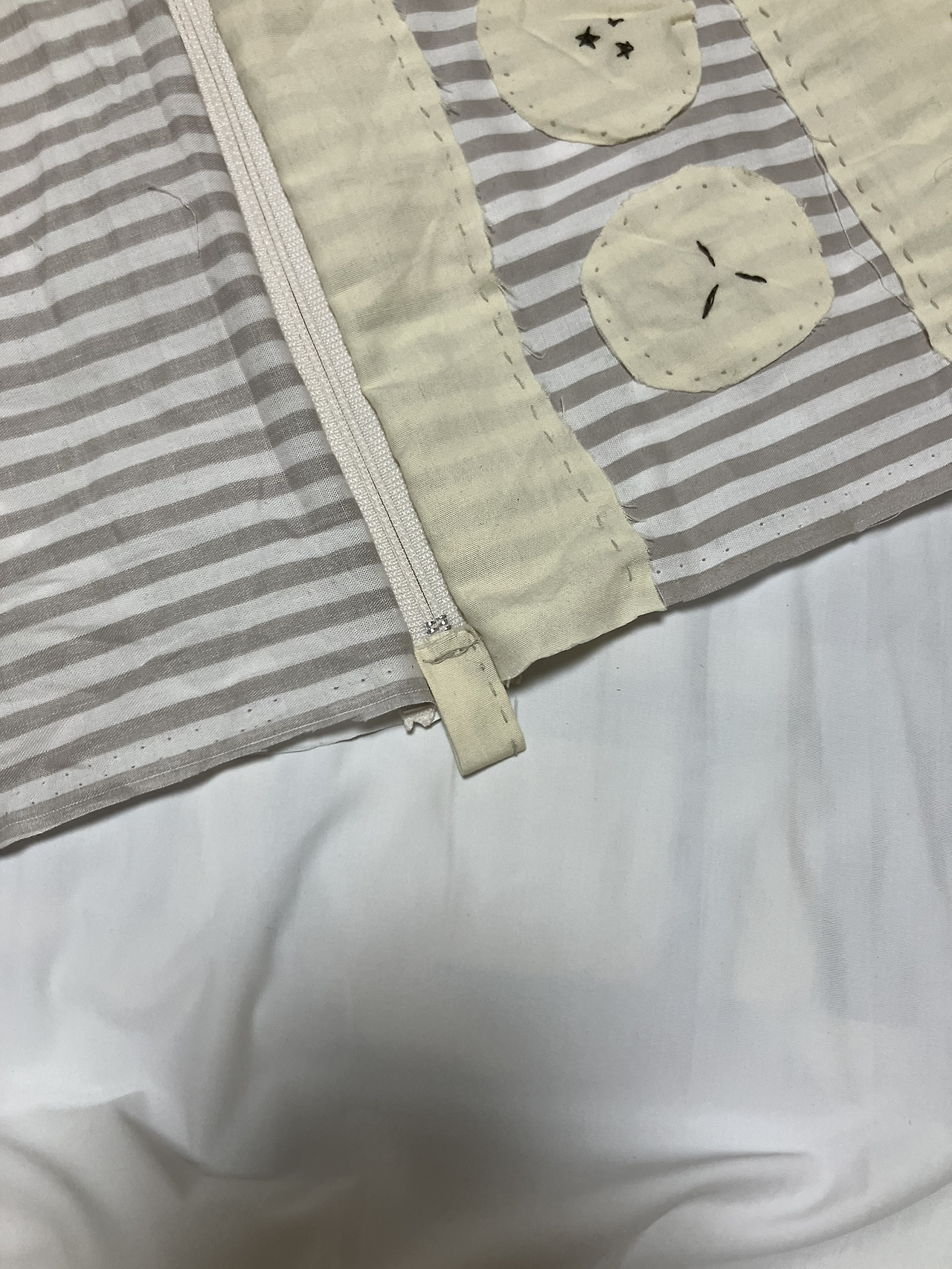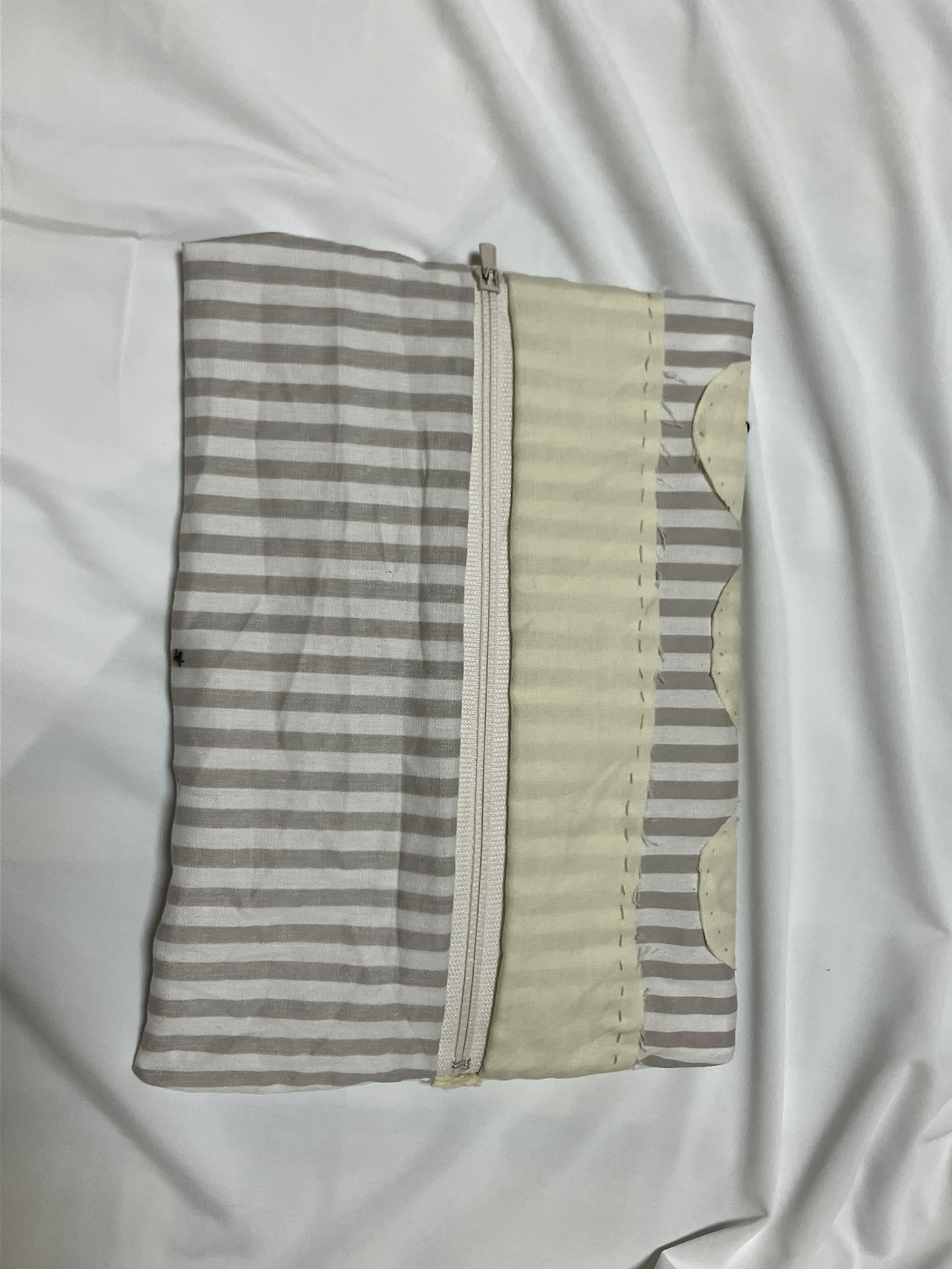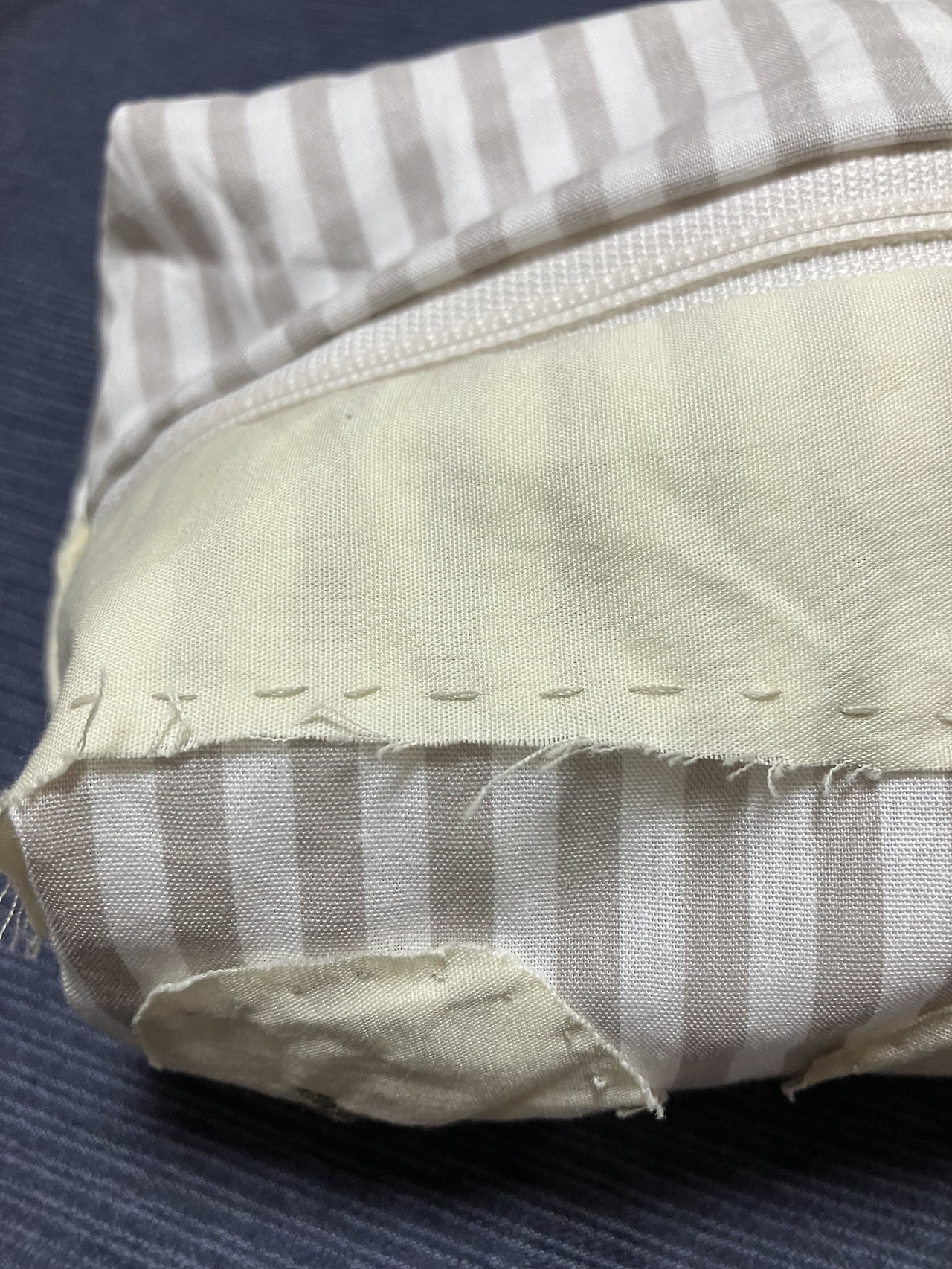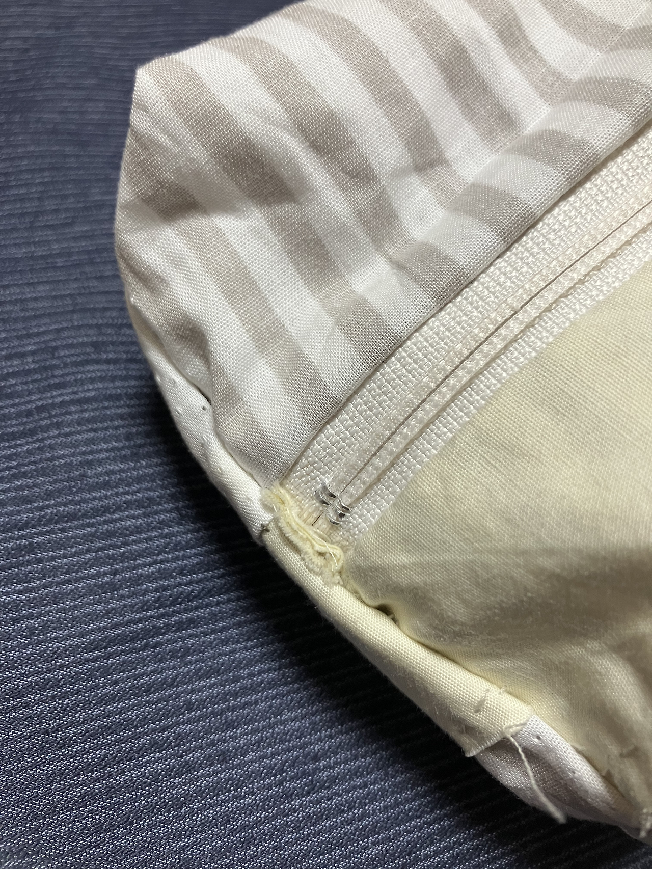 앞면과 뒷면을 지퍼에 연결했다. 처음에 뒤집어서 꿴 줄 알고 매듭을 다 풀었는데, 똑바로 하고 있었다. 스스로에 대한 괜한 불신과 의심 때문에 헛수고했다. 지퍼 끝에 라벨도 붙였으나, 마지막에 옆면 바느질을 할 때 거리 계산을 잘못해 라벨이 안감 속으로 숨어버렸다. 꺼낼 수도 없고 그저 나만 아는 옥에 티가 되었다. 이게 핸드메이드의 묘미겠지!
