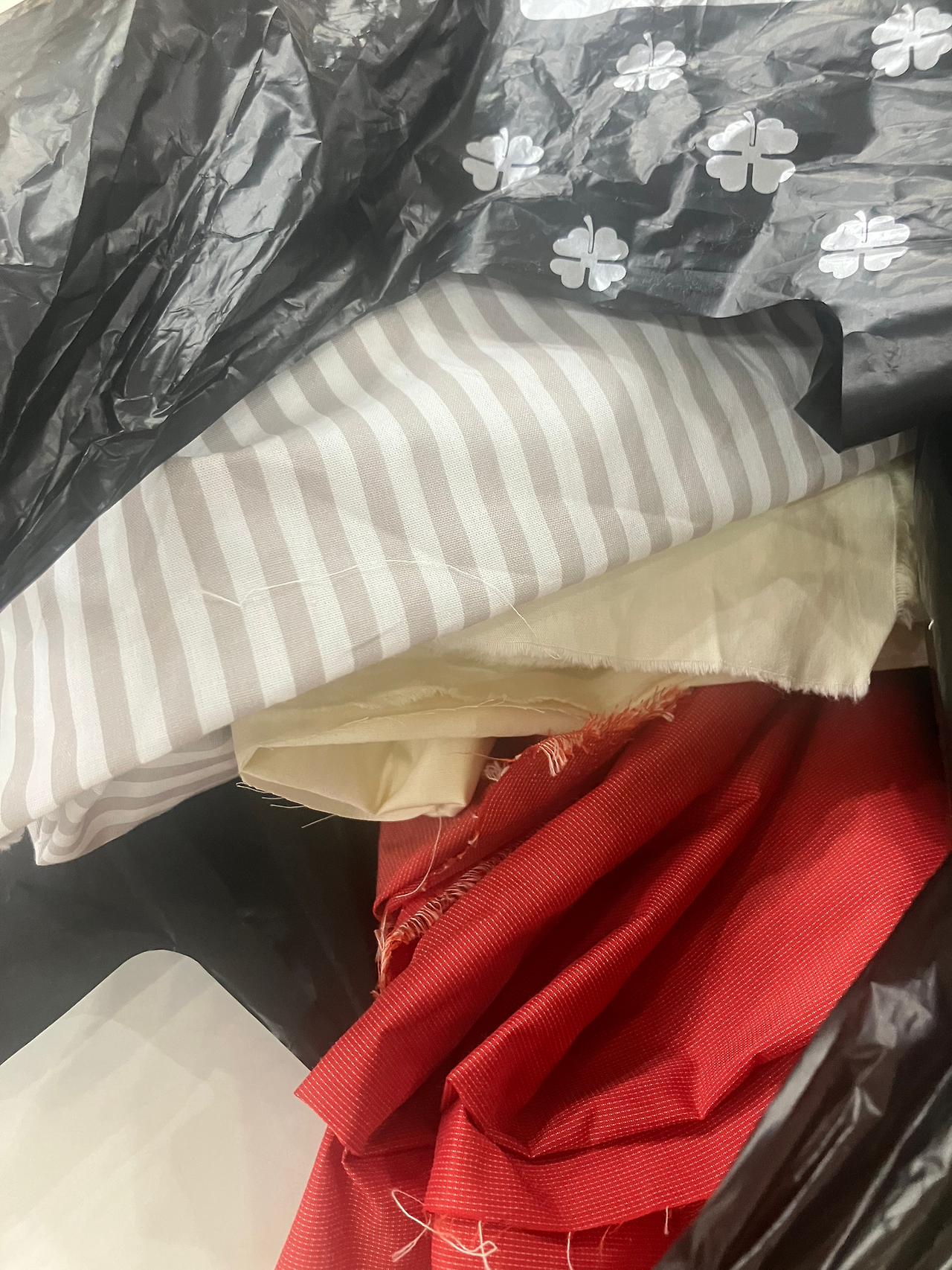 4. 빨간색 잔땡땡이 천. 두꺼운 현수막 질감. 이건 잘못 샀으나 어떻게든 회생시키기!