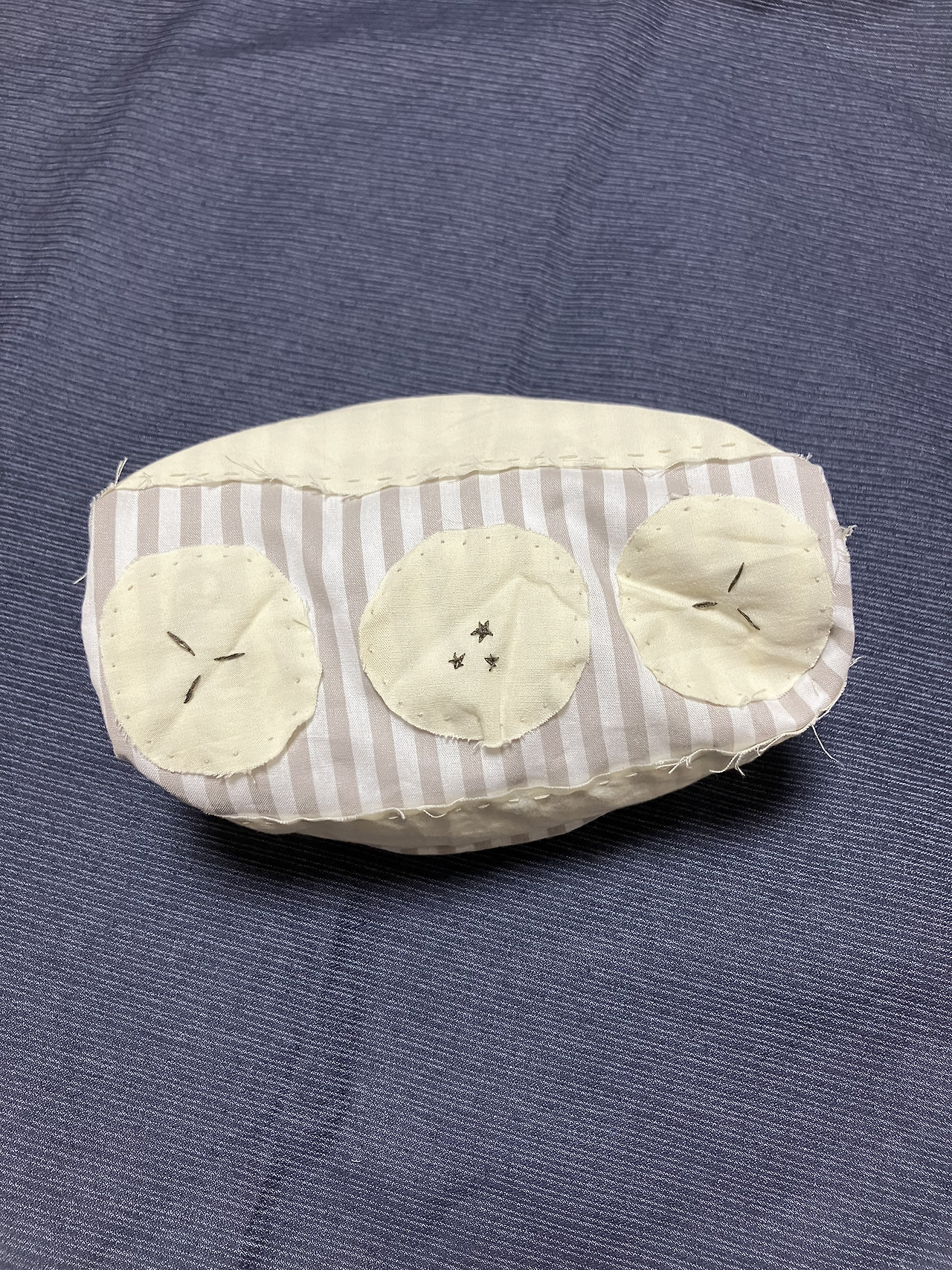 모든 준비가 끝났다. 이제 만들기만 하면 된다. 가장 먼저 연노랑색 천을 집어 들고, 가위로 쓱쓱 오려 동그란 형태로 잘라냈다. 가운데에 갈색 실로 자수를 박아 단면이 잘린 바나나 세 조각을 완성했다. ‘산도’라 하면 폭신한 식빵이 빠질 수 없지! 이번엔 천을 네모나게 자른 뒤 스트라이프 무늬 원단 위에 덧대었다. 바늘을 위로 꽂고, 일정한 간격을 두고 아래에 꽂고, 다시 일정한 간격을 두고 위로 꽂기를 반복했다. 톡톡 끊겨보이는 실이 내 눈에는 귀엽다. 그렇게 홈질인지 시침질인지 알 수 없는 바느질을 계속 이어갔다.