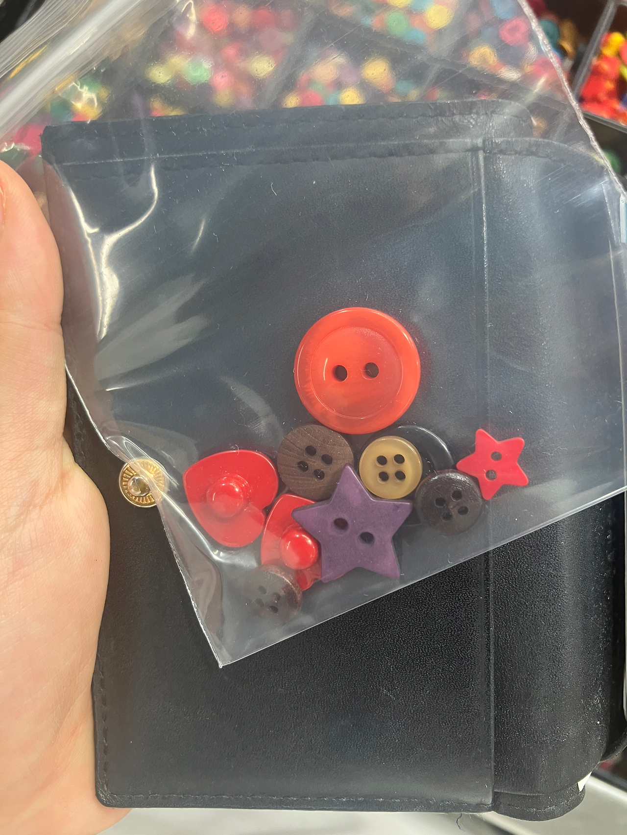 겉감용 그리고 안감용 원단이 필요하다. 실과 바늘은 집에 엄마가 쓰던 것들이 많고, 미싱은 중고로 찾아봤는데 몇십만 원 이상 넘어가 포기했다. 배보다 배꼽이 커지면 안 되니까! 중학생 때 마지막으로 배운, 어설픈 손바느질로 우선 시작해 보기로 했다. 이어서, 파우치에 달 지퍼도 필요했고, 지퍼 대신 단추를 다는 것도 좋아 보였다.