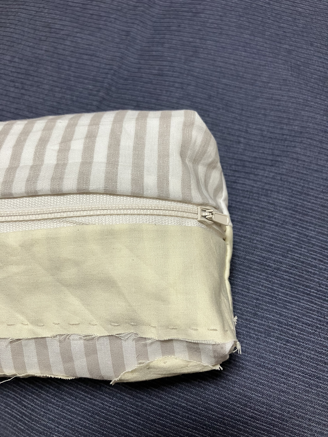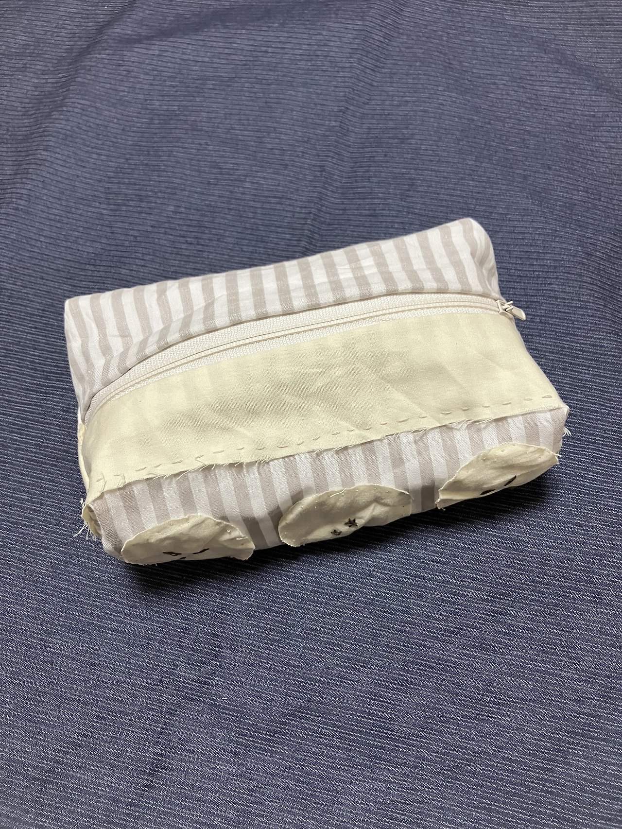 모든 면을 꿰고 난 뒤, 안감을 뒤집어 겉감을 밖으로 꺼냈다. 어라 내가 생각한 모양은 이게 아닌데! 앞면이 온전히 보여야 하는데, 파우치는 너무 납작하고 눈에 띄는 건 지퍼뿐이었다. 모서리를 네모나게 잘라내고, 사선으로 실을 박아 벽을 세웠다.