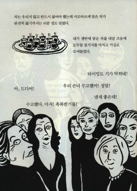 마르잔 사트라피의 만화책 <바느질 수다>는 이렇게 소개한다. 손녀딸이 할머니와 이웃들을 위해 차를 내온다.