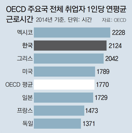 한국인은 바쁩니다. 조사 결과를 보더라도 2014년 기준으로 한국인의 연평균 노동시간은 2124시간으로 OECD 가입국 중 2위를 차지하고 있을 정도죠. 1위 멕시코를 빼면 세계에서 가장 긴 노동시간을 자랑하고 있다고 할 수 있습니다. 독일과 비교하자면 연간 4개월을 독일보다 더 일하고 있는 시간이라는 계산까지 나올 정도라고 합니다.