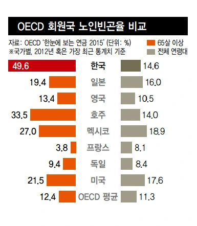 역시나 문제는 기성세대들인 것이죠. 특히나 1955-1963년에 태어난 베이비부머 세대 700만 명이 은퇴를 시작하면서 그들의 노후를 걱정하지 않을 수가 없습니다. 게다가 한국의 경우 OECD 가입국 중에서도 노인빈곤율이 가장 심각한 수준이다 보니 은퇴 후에도 집에서 놀고 있을 수가 없는 상황입니다. 다시 일자리를 구해야 하는 것이죠. 그런데 문제는 그들이 할 수 있는 일자리가 많지 않다는 점입니다. 기존의 일자리는 젊은 세대들이나 자동화 기술로 대체가 되지만 새롭게 생겨나는 일자리는 빠른 적응력과 컴퓨터 활용능력, 상당 시간의 교육을 요구하는 일이 많기 때문입니다. 60세 이상 은퇴자들이 데이터 과학자, 소프트웨어 개발자가 되는 것은 현실적으로 무리가 있겠죠?