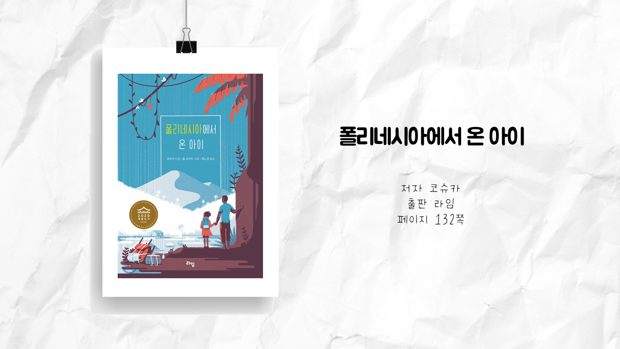 <폴리네시아에서 온 아이>는 기후난민들의 이야기를 마음으로 그리며 고향을 잃는 아픔, 낯선 땅에서의 새로운 시작에 대한 두려움과 불안함, 힘겨운 시작마저 방해하는 주변의 따가운 시선과 편견 등을 말하고 있습니다. 기후변화는 단순히 해수면이 몇 cm가 상승하고 혹은 지구의 온도가 몇 도 올라가는 문제가 아닙니다. 기후변화는 한 인간의 삶, 한 가족의 삶 나아가 사랑하는 우리나라의 역사를 망가뜨리는 일입니다. 우리는 기후변화를 머리보다 마음으로 먼저 이해할 필요가 있습니다. 그것이 미래가 될 아이들이 환경의 문제를 진심으로 대하는 방법이 될 테니까요.