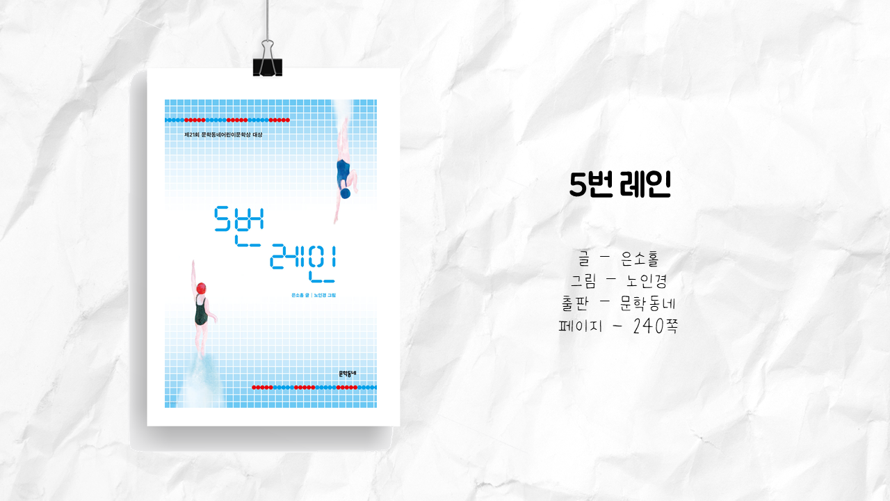 꿈이나 진로를 다루는 문학 책들은 많습니다. 오늘 소개할 <5번 레인>도 어린이들이 가지고 있는 '꿈'을 이야기하는 책이죠. 그럼에도 불구하고 이 책이 귀한 이유는 꿈을 꾸는 어린이들의 마음에 귀를 기울인 책이기 때문입니다. 결국 꿈이라는 건 자신이 세우고 도전해야 하는 것입니다. 꿈에 대한 이유가 누군가에 의해 만들어질 수도 있겠지만 그 이유는 오래가지 못할 것이고 누군가의 부추김에 도전할 수도 있겠으나 나아가기에는 동력이 부족할 것이 분명합니다. 결국 꿈을 꾼다는 건, '자기 자신'을 들여다봐야만 하는 일입니다.