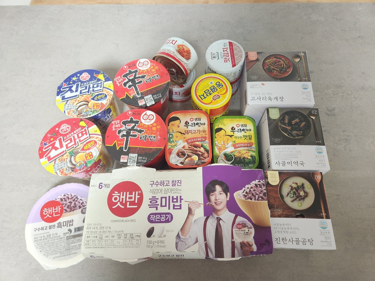 (라면, 햇반, 참치, 김치, 장조림, 육개장, 사골곰탕 등)