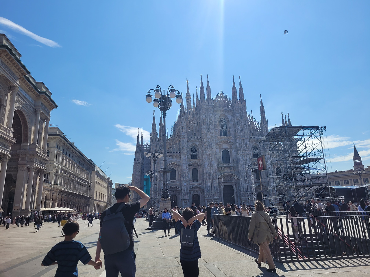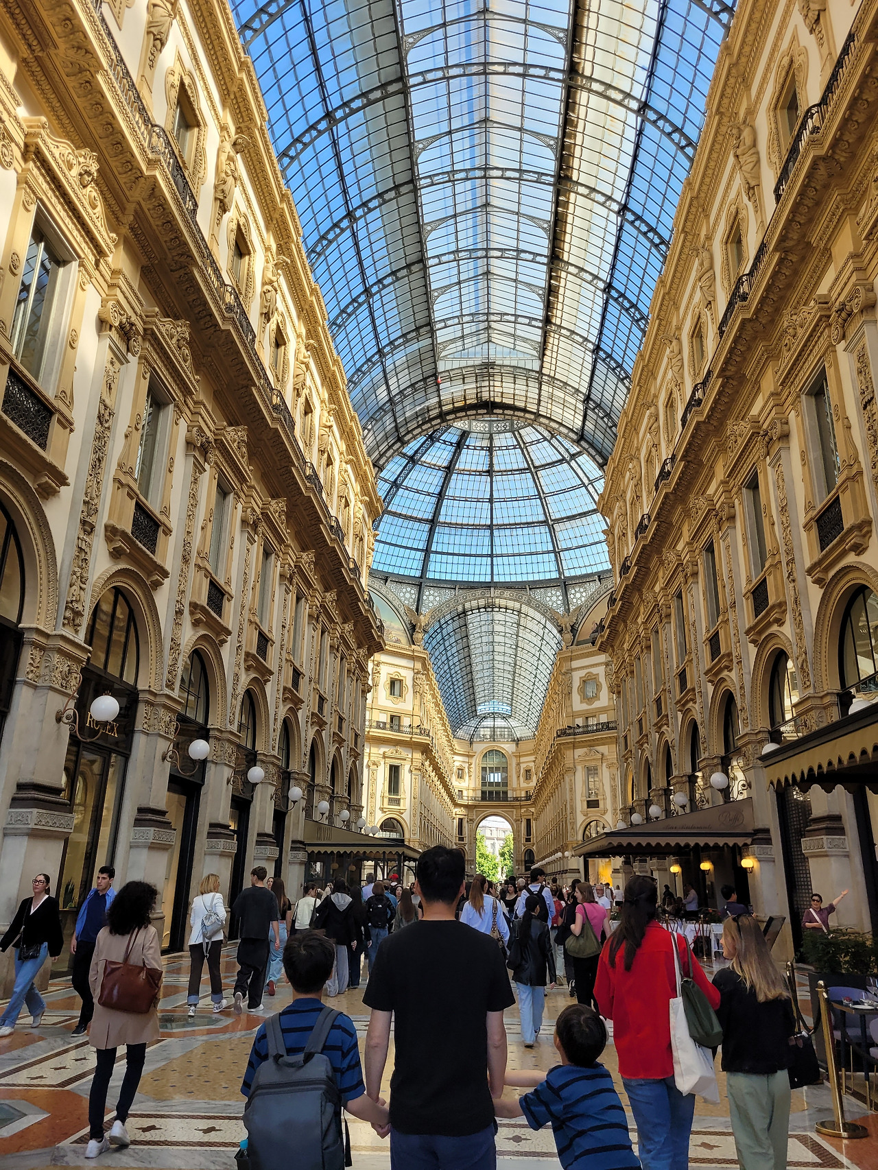 우리에겐 시간이 별로 없다. 아이들이 그리는 동안 남편과 나는 돌아다니며 밖에서 두오모성당을 구경했다. 이곳에 와있고 실제로 성당을 보며 아이들이 그림을 그릴 수 있음에 감사하다. 20~30분 정도 이렇게 시간을 보내다 첫째가 좋아하는 레오나르도다빈치 기념비를 보고 돌아가야지 했다. 그런데 가는 길이 비토리오 에마누엘레 2세 갤러리가 있었다. 두오모광장 바로 앞이라 그 길을 통해 지나갔다.