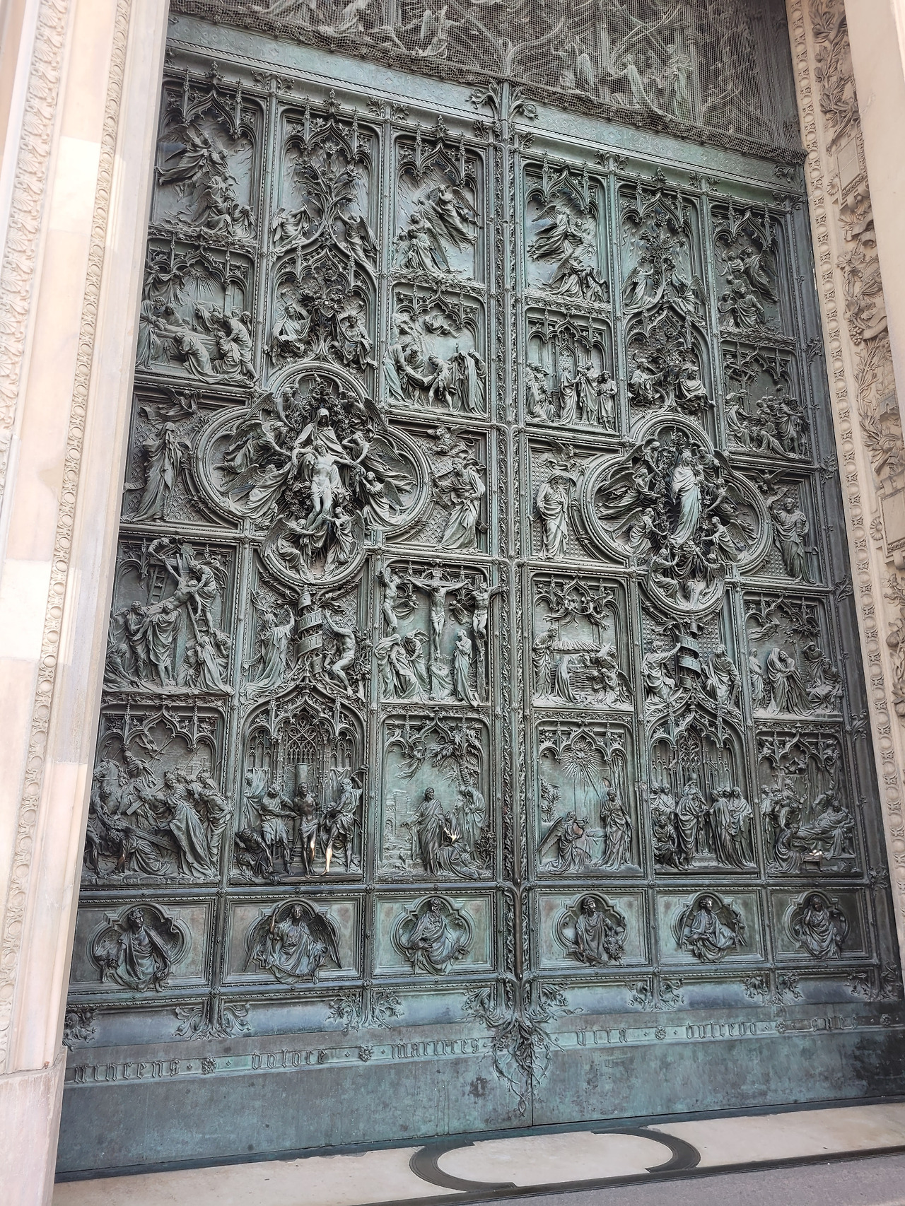 이탈리아 밀라노 두오모 성당은 옥상의 135개의 탑 하나하나마다 성인을 조각한 것이 유명하다. 그리고 가장 높은 첨탑에는 황금빛 마리아상이 서있다. 그러나 우린 거긴 올라가지 않으니 성당 정면에 있는 마리아의 일생에 관한 내용을 부조로 새긴 청동문을 보았다.