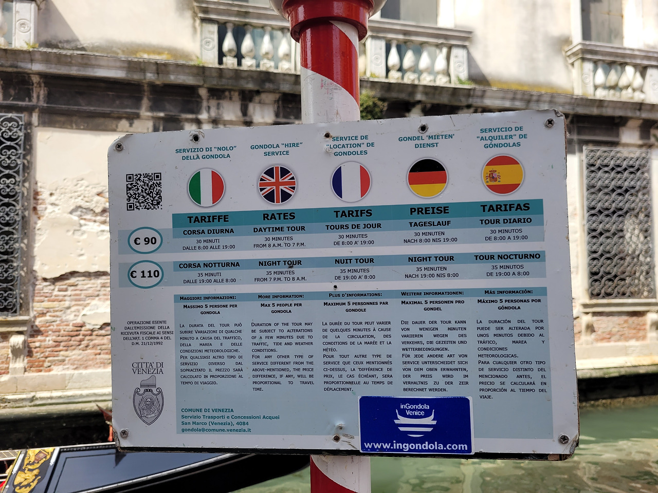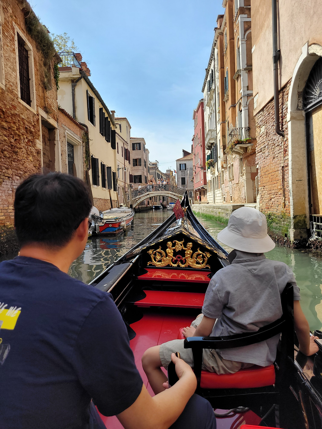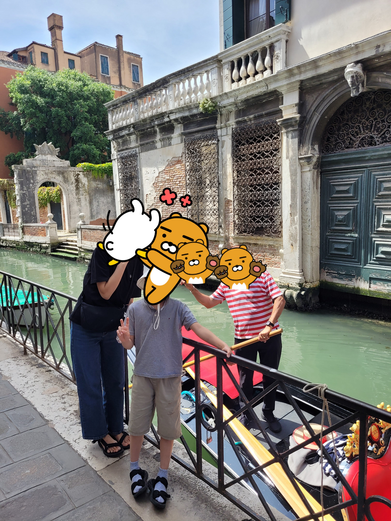 90유로이다. 알뜰한 우리 남편도 이건 타볼 만한 가치가 있는 거 같다며 네 식구가 같이 탔다. 30분간 곤돌라를 타며 베네치아의 찰랑거리는 물도 보고 건물도 보고 이때까지는 여유로웠다. 빨간색과 흰색의 줄무늬 티셔츠를 입으신 분은 곤돌라 35년 장인이시다. 안전하고 친절하게 해 주셔서 감사했다.