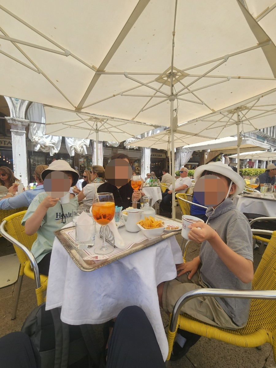 괴테가 산마르코광장을 유럽 최고의 응접실이라고 했던가. 도착하자마자 이곳에 와있음이 너무나 감사했다. 특히 세계 최초의 커피숍인 카페 플로리안에서 악기를 연주하시는 분들 덕분에 분위기는 더욱 좋았다. 카페 플로리안은 너무 비싸서 사실 근처 저렴한 커피숍에 갈까 했는데 광장분위기가 너무 좋아서 그냥 이곳에 있기로 했다. 사실 시간이 얼마 안 남았다. 이곳에서 1시간 정도 쉬다가 Libraria Acqua Alta(서점) 들렸다가 가야 한다. 아침을 든든히 먹어두길 잘했다. 아이들은 이곳에서 그림을 그리며 핫초코를 마시고 남편과 나는 아페롤스프리츠를 마시며 베네치아를 만끽했다.