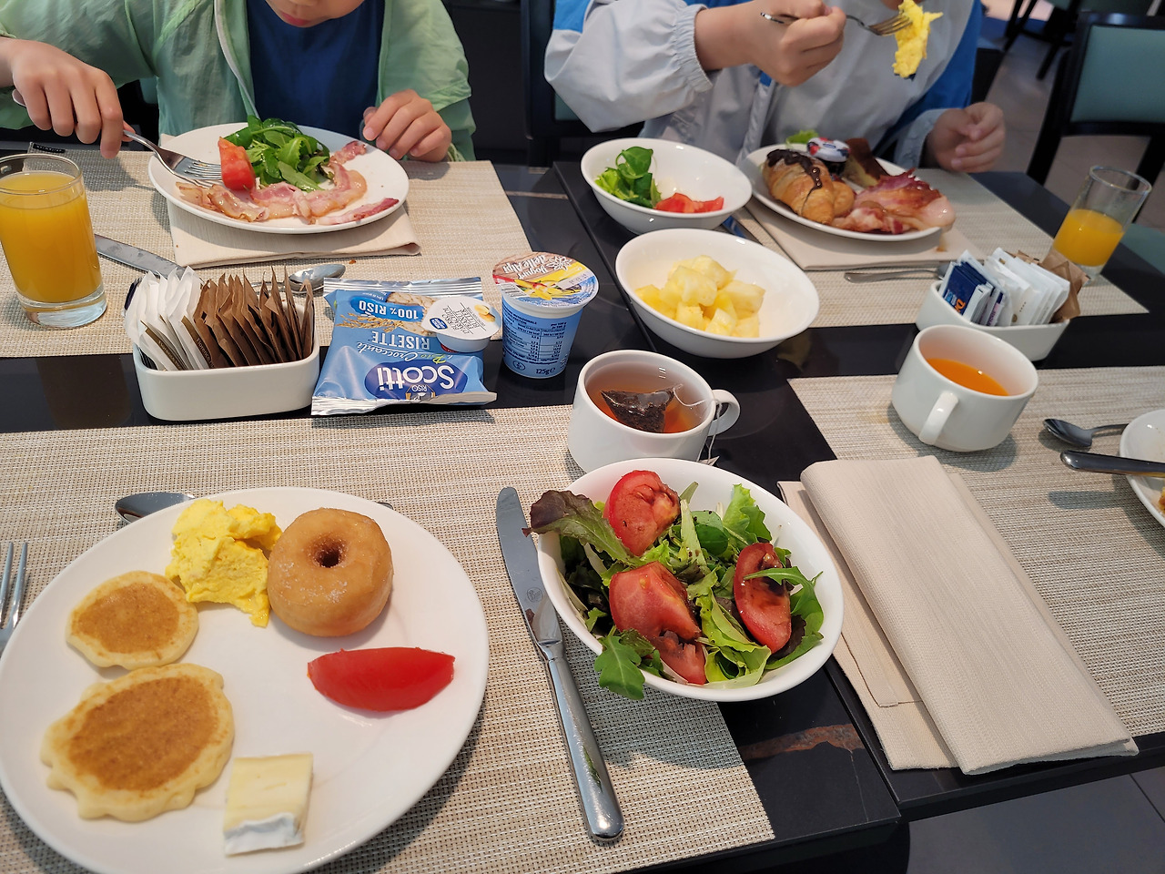 다음날이다. 조이가 몸 여기저기에 모기에 물렸다. 어젯밤 창문을 열어두고 자서 물렸나 보다. 아침에 남편은 다행히 기분이 좋아 보인다. 다 같이 조식을 먹으러 향했다.