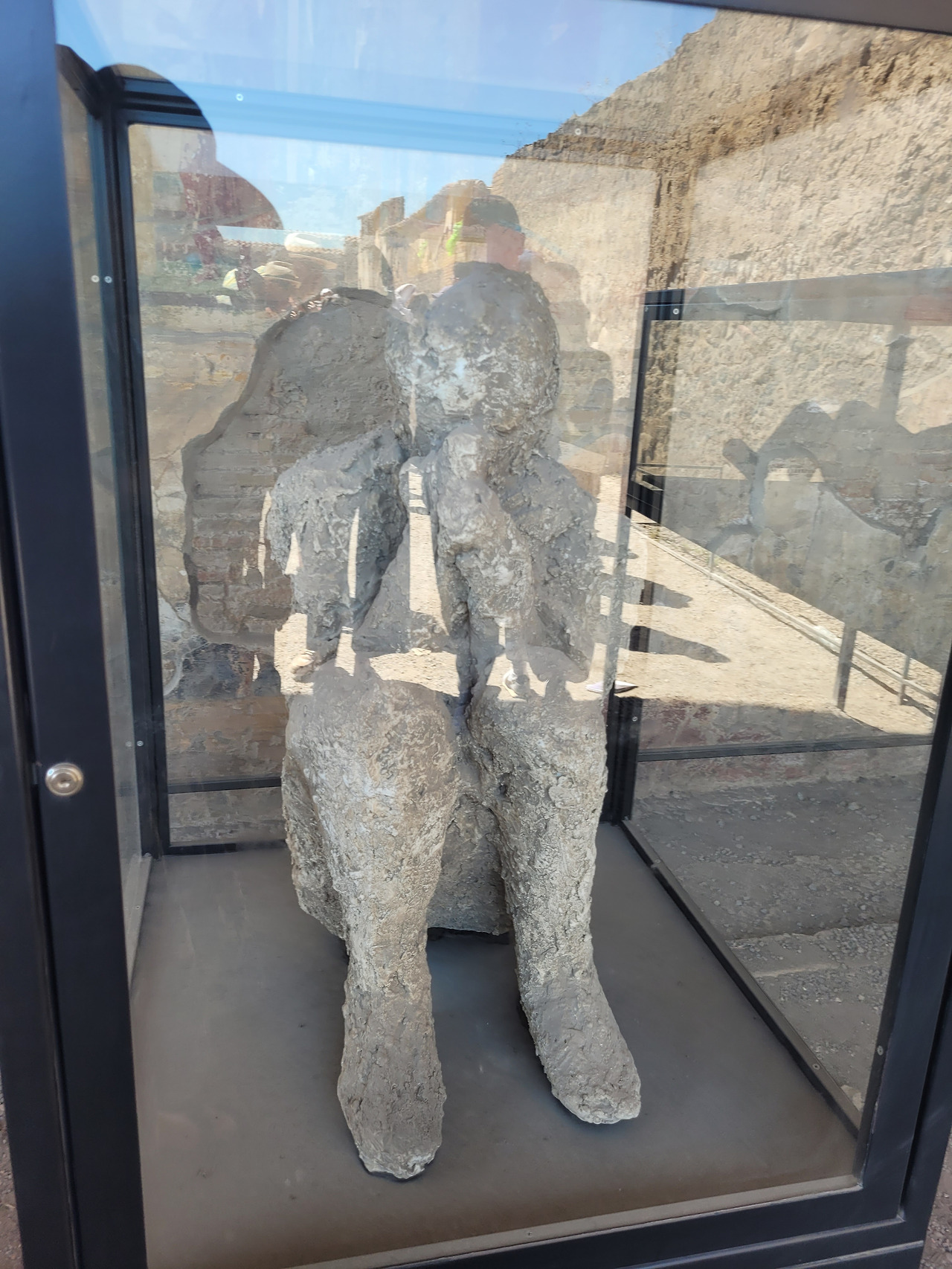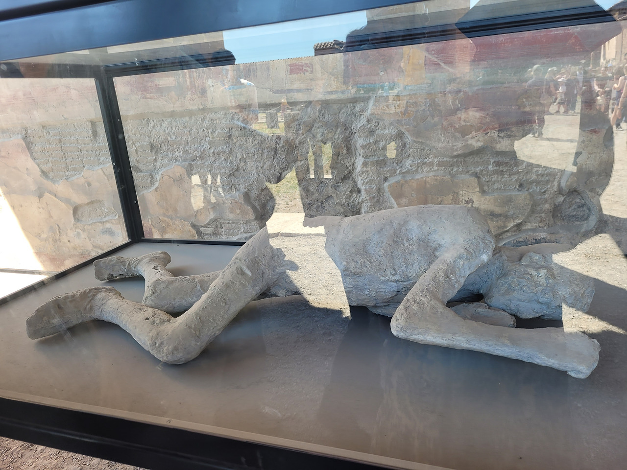 화산폭발이 있었던 그곳에서 화산재로 인해 약 2000명의 주민이 화산재에 목숨을 잃었다. 하지만 이 폼페이가 발견되었을 당시 사람들의 모습은 전혀 보이지 않았다고 한다. 그때 땅 사이사이에 구멍이 있었는데 그곳에 액체로 만든 석고를 붓고 굳었을 때 땅을 뜯어내면 위와 같이 사람의 형상이 나타났다고 한다. 그 당시 고통스럽게 죽어간 모습들이라 보는데 마음이 좋지 않았다.