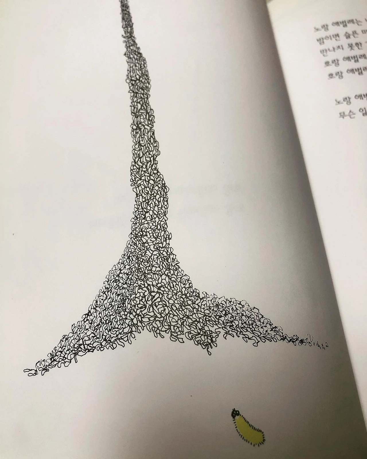 나비가 된 노랑 애벌레에 이끌림으로 자신이 견뎌내야 할 인고의 시간은 미련하게 올라간 애벌레 기둥이 아니라 나비가 되기 위한 번데기의 시간이며, 그 시간을 통해 진심 높은 곳으로 올라갈 수 있는 나비의 삶을 택한다
