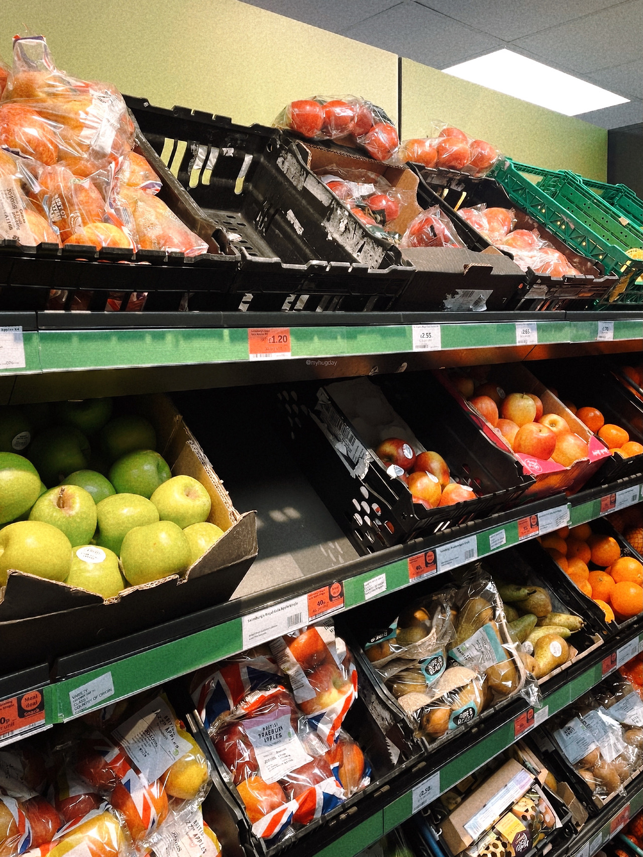 런던에 온 후 한 번도 과일을 먹지 못한 것 같아 과일을 사러 집 근처 마트 'Sainsbury's'를 방문했다. 런던의 외식 비용은 충격적일 만큼 높은데 식료품점에서 직접 장을 보는 비용은 꽤 합리적이다. 게다가 종류는 또 어찌나 많은지! 사고 싶은 것들이 너무 많아서 참느라 혼났다. 나는 사과와 피넛버터, 그리고 글루텐프리 식빵을 사서 집에 돌아왔다. 한국에선 글루텐프리 빵을 사려면 그러한 빵을 만드는 극소수의 전문점을 찾아가야만 하고 가격도 거의 두 세배 비싼데, 여기선 동네 수퍼마켓에서도 저렴한 가격에 손쉽게 살 수 있다는 점이 정말 좋다.