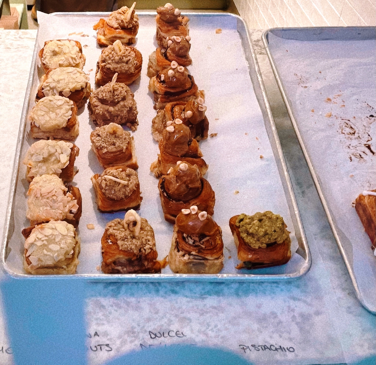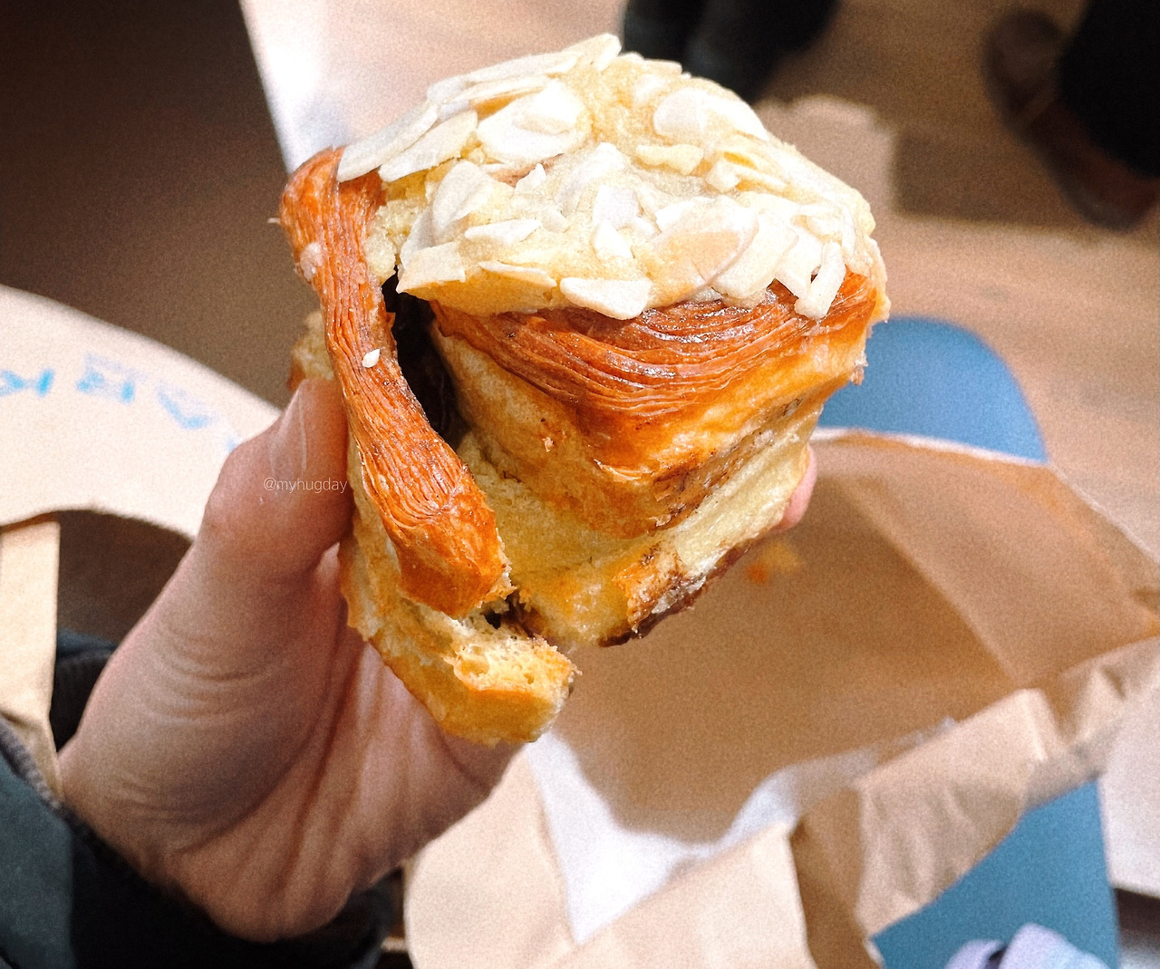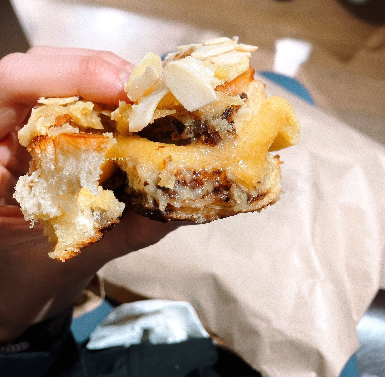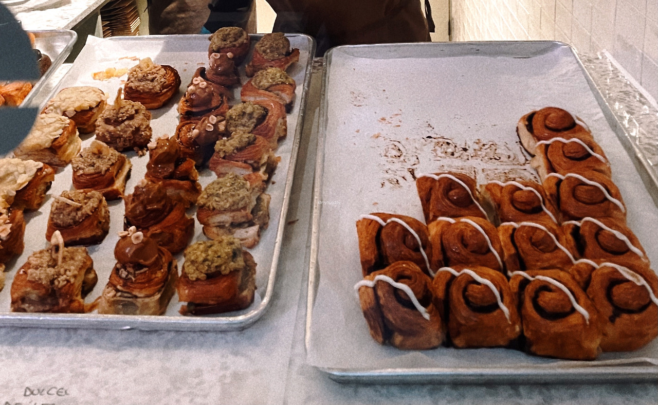 먹어보고 싶은 마음과 가격에 대한 부담감 사이에서 몹시 갈등하던 중 때마침 매장 내 간이 의자에 한 무리의 가족이 이 베이커리에서 산 빵을 나눠 먹고 있기에 작은 목소리로 맛있냐고 물어보았다. 그랬더니 빵은 정말 맛있으며, 다만 시나몬은 차갑게 식었고 아몬드가 따뜻하니 가장 추천한다고 대답해 주었다. 그래서 나는 그 말을 믿고 아몬드를 주문했다. 빵은 내가 생각한 것보다 훨씬 부드럽고 촉촉하고 달콤하고 맛있어서 정말이지 몸이 사르르 녹아내릴 것 같았다. 그와 동시에, 얼마나 버터와 설탕을 많이 넣었으면 이런 맛이 나올까 하는 생각이 들어 약간 소름 끼쳤다.