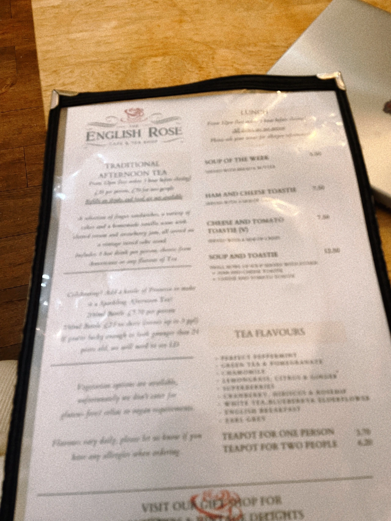 글자를 식별하기 힘들게 사진이 나왔지만 양면 중 한쪽 면의 메뉴이다. 보통 스콘 하나와 차 한잔을 함께 마시면 약 10파운드 내외, 애프터눈티세트를 즐기면 인당 35파운드를 예상하면 된다. 명확하게 기억나진 않지만 Breakfast 메뉴도 있었던 것 같다.