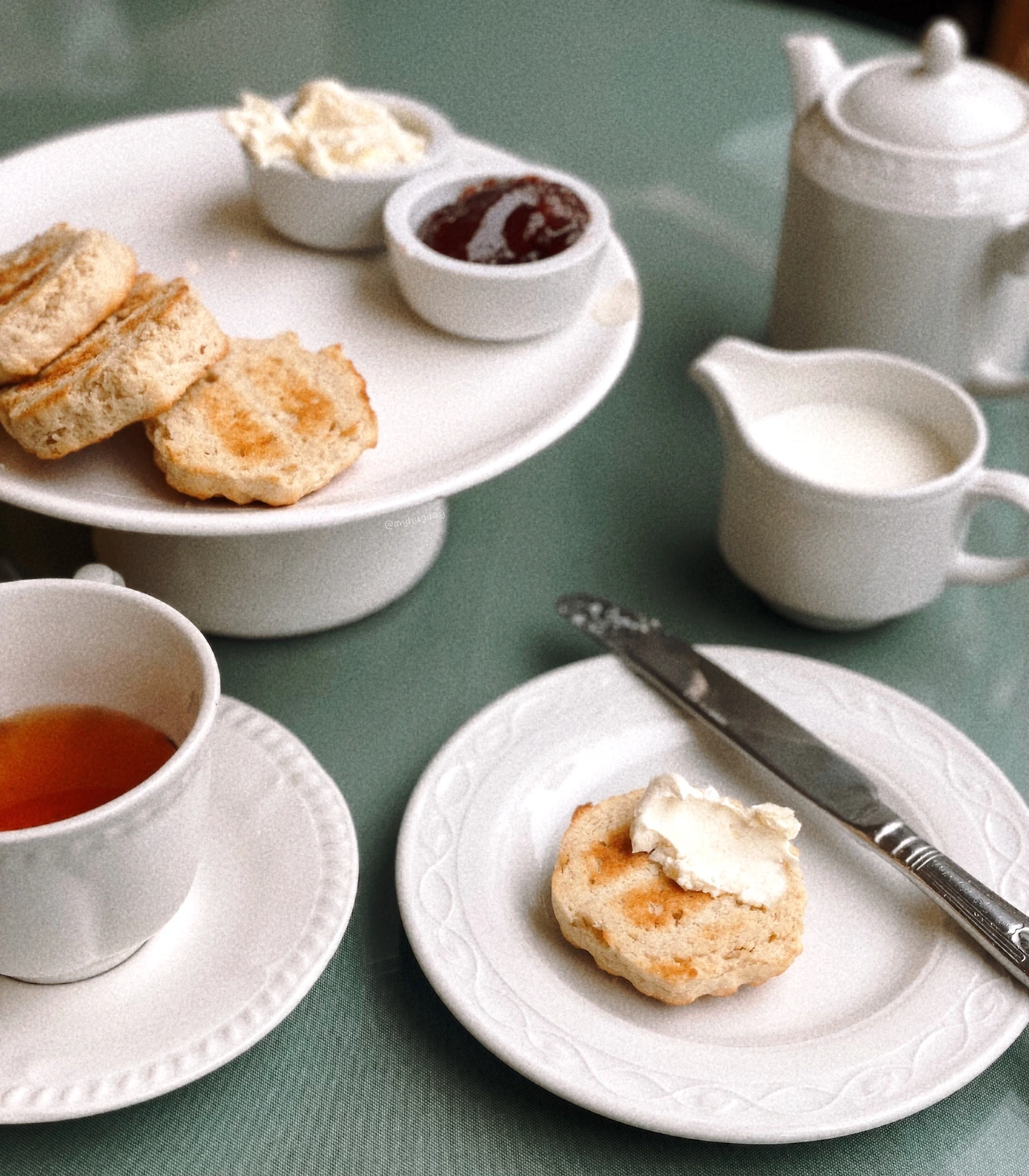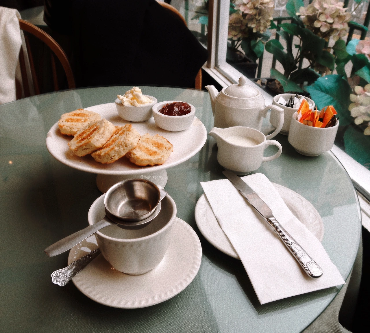 크림티 세트를 주문하니 Toasted Scone 네 조각과 클로티드크림, 라즈베리잼이 차와 함께 제공되었다. 스콘을 토스트하다니 확실히 다른 찻집들과는 차별화를 꾀하긴 했다. 가장 인상적이었던 점은 빈티지한 인테리어만큼이나 빈티지한 식기를 사용한다는 것인데, 접시는 누가 봐도 한눈에 알 수 있을 만큼 큰 크기로 이곳저곳 이가 나가 있었고 흰색의 다구들은 회색에 가깝게 빛이 바랬다.