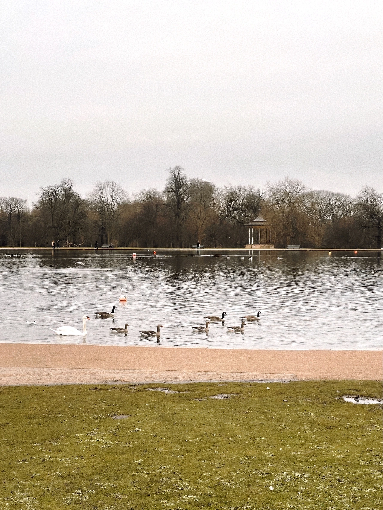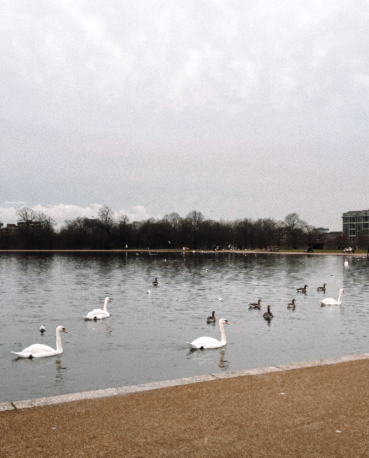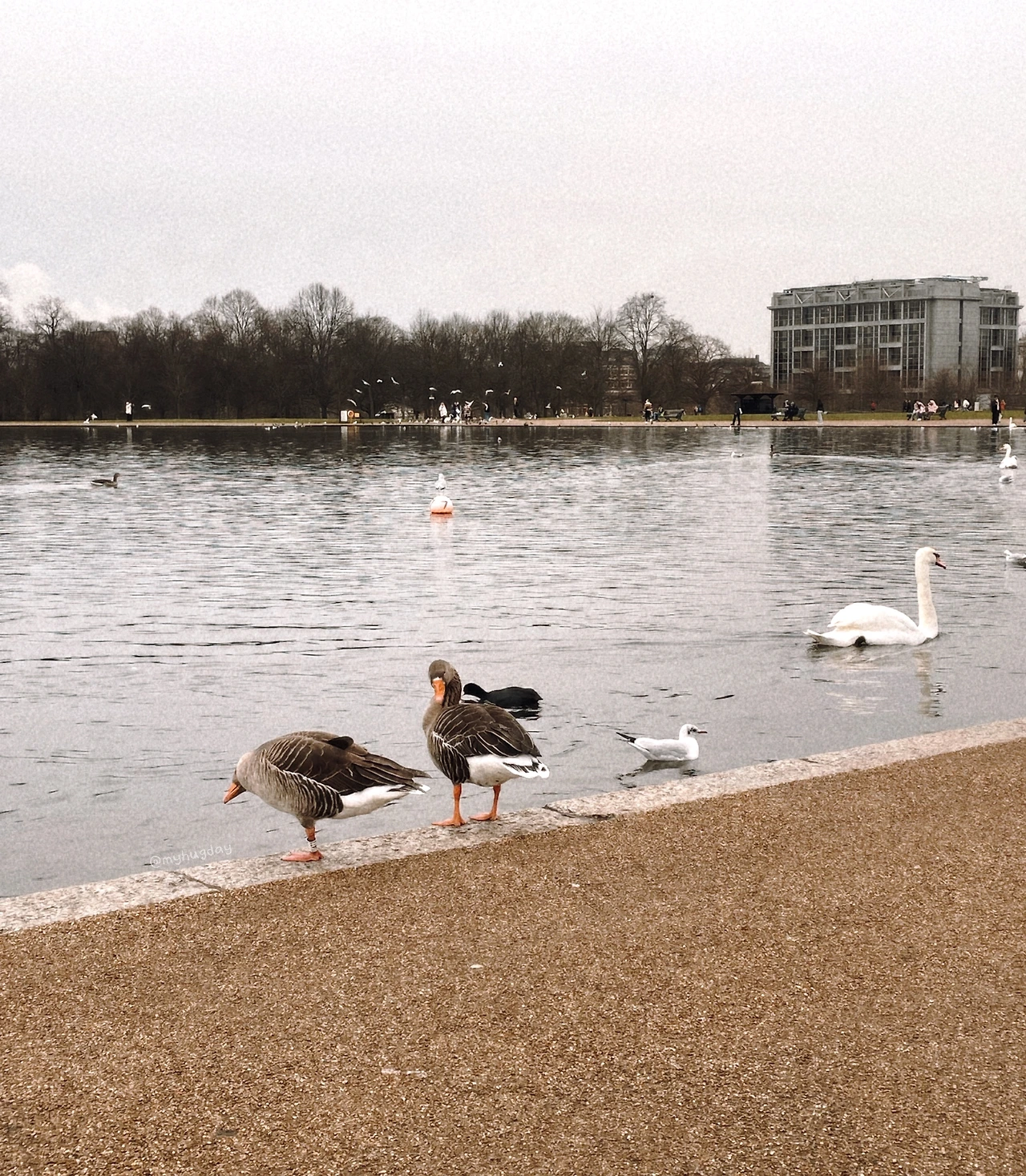 하지만 이들의 한가로운 시간에는 간식 시간도 포함이 되어있는 모양이다. 연못가의 사람들로부터 음식을 얻어먹겠다고 (특히 비둘기들!) 기웃거리는 통에 나는 도저히 스콘을 먹을 수가 없었다. 내 스콘을 호시탐탐 노리는 수많은 새들로 인해 결국 나는 연못가를 떠나 멀리 떨어진 벤치로 피신해야만 했다.