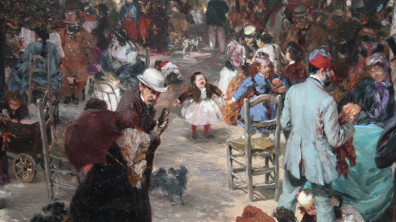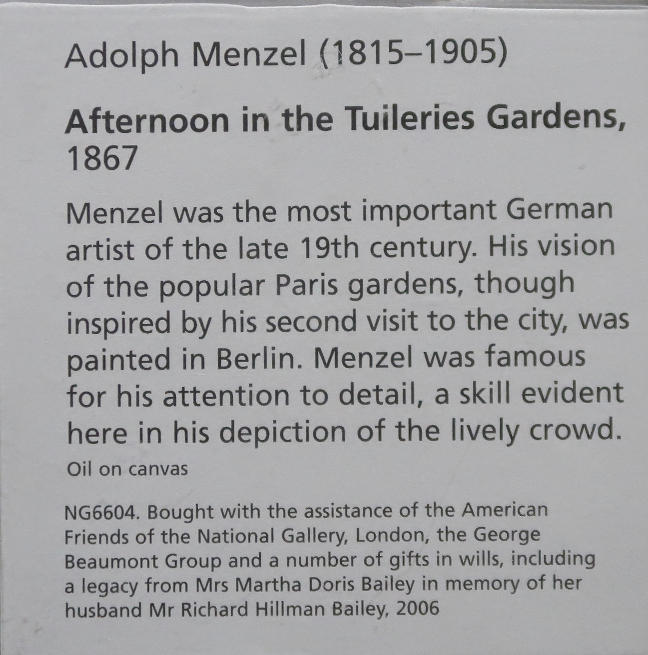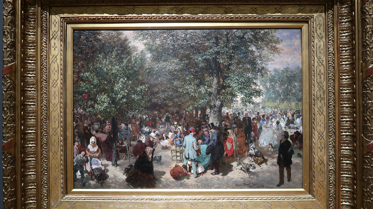 깨알같이 그려 넣은 사람들 한 명 한 명을 살펴보는 재미가 있는 이 그림은 (안내문에 의하면) 19세기 후반 독일에서 가장 중요한 화가였던 Adolph Menzel(아돌프 멘첼)의 <튈르리 정원의 오후>로, 그가 파리를 방문하였을 때 파리에서 영감을 받아 베를린에서 그린 작품이라고 한다. 멘첼은 세밀한 묘사에 뛰어난 화가로 유명했고, 이 그림 또한 군중의 모습에서 생동감과 정교함을 엿볼 수 있다고 소개되어 있다.