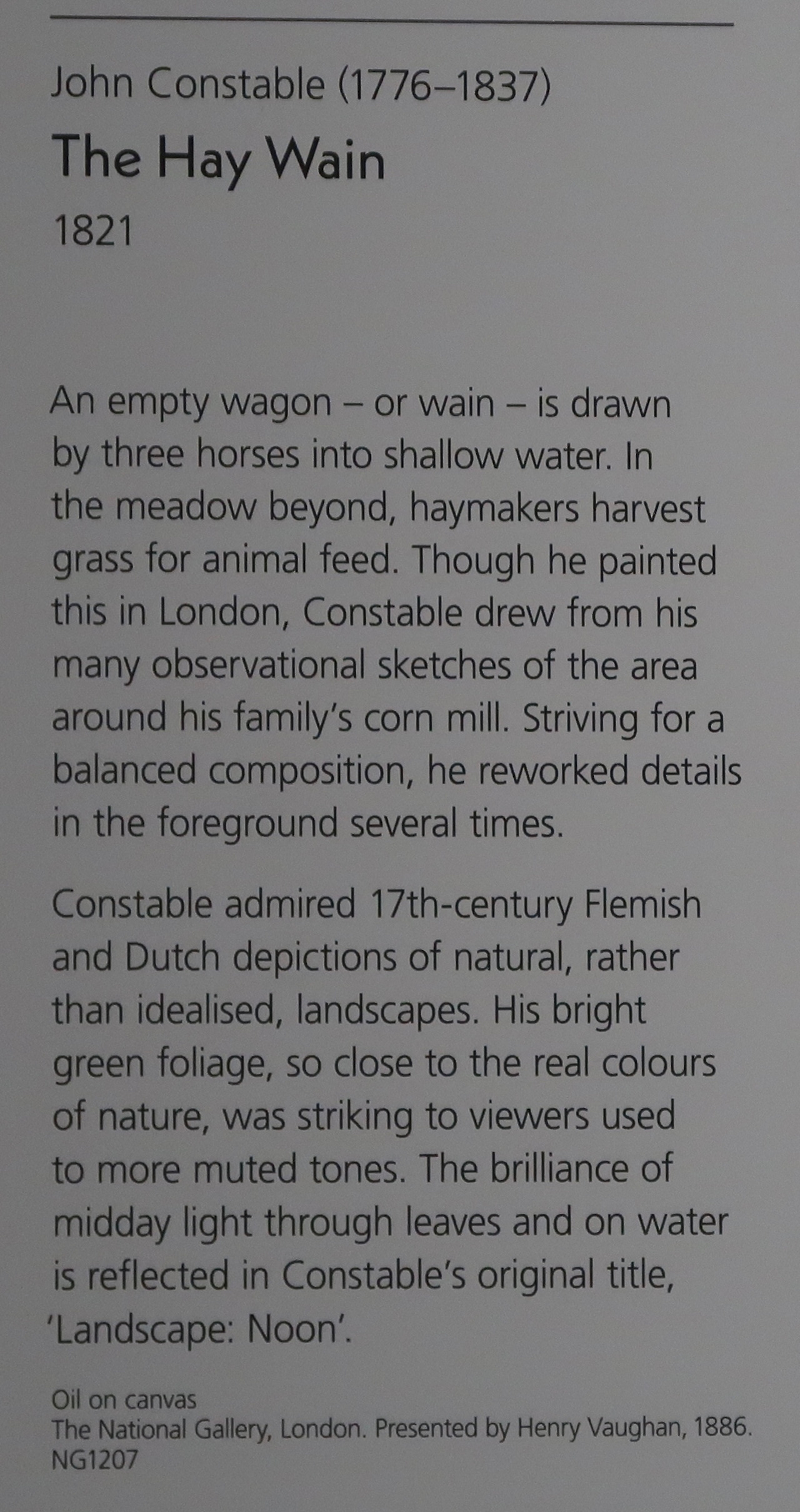 영국의 또 다른 유명한 화가인 John Constable(존 컨스터블)의 공간도 비중 있게 꾸며져 있었는데 그중에서도 특히 유명한 작품인 <건초 마차>가 걸려있다. 안내문에 의하면 그는 균형 잡힌 구도를 추구했고, 17세기 플랑드르와 네덜란드 화가들이 자연의 있는 그대로의 풍경을 묘사하던 방식을 따랐다고 한다. 차분한 색조의 풍경화에 익숙했던 당시 사람들에겐 컨스터블의 밝은 초록색과 사실적인 자연의 색이 인상적이었을 것이라고 한다. 그는 본래 이 작품의 제목을 <풍경 : 정오>로 지었다고 한다.