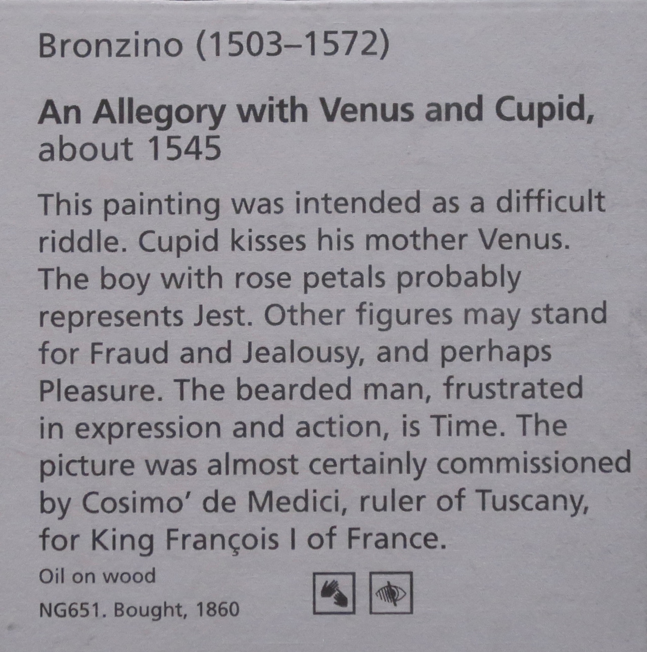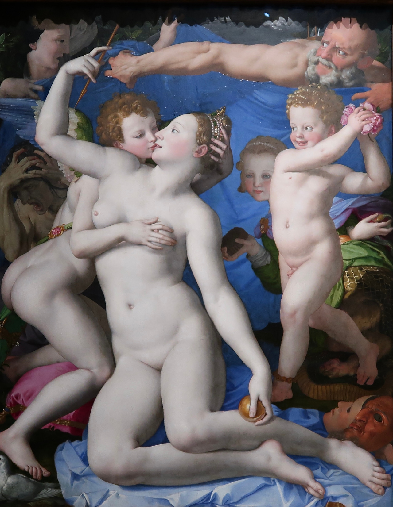 기묘한 이 그림은 Bronzino(브론치노)의 <비너스와 큐피드의 알레고리>로, 난해한 수수께끼처럼 의도된 그림이라고 한다. 큐피드는 어머니인 비너스에게 키스를 하고 있으며, 장미 꽃잎을 들고 있는 소년은 농담(Jest)을, 다른 인물들은 기만(Fraud)과 질투(Jealousy) 또는 쾌락(Pleasure)을 상징하고 있을 수도 있다고 설명한다. 수염 난 남자는 좌절한 듯 보이며 시간(Time)을 상징한다고 한다. 설명을 읽고 나니 그림이 조금 더 재미있게 보인다.