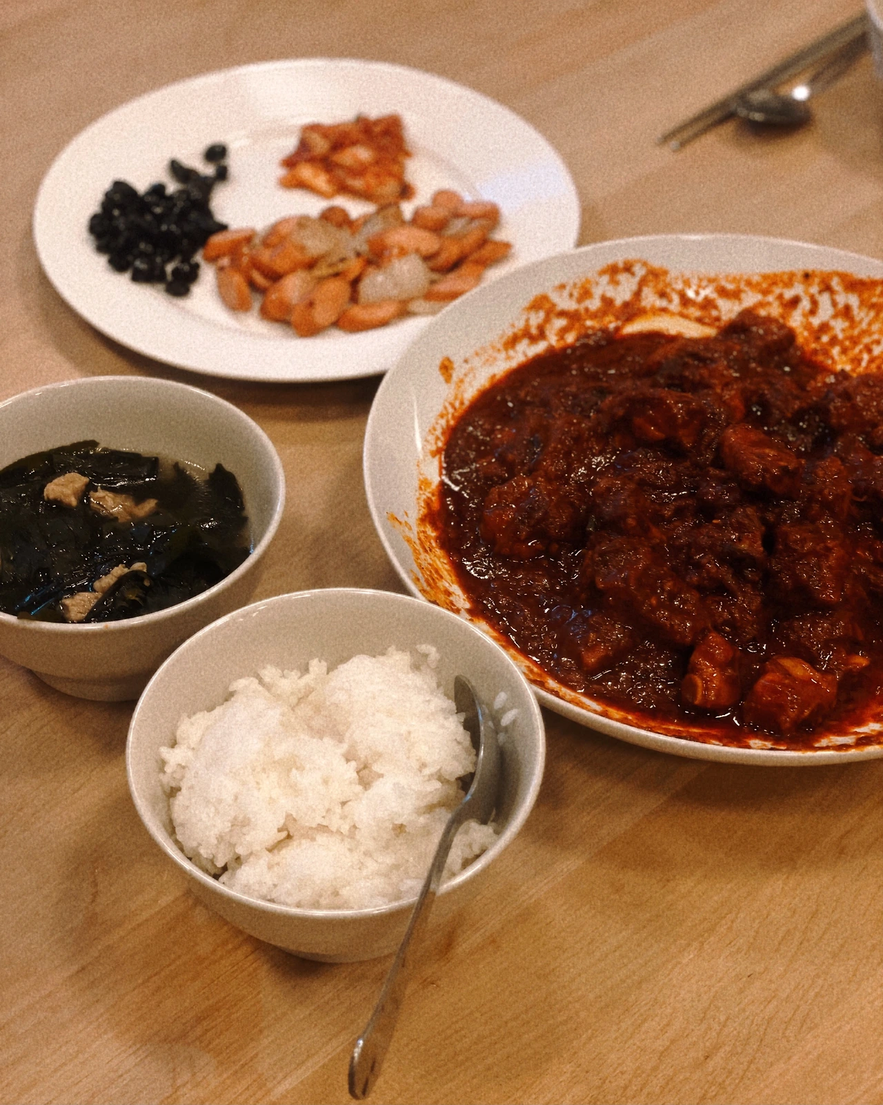 오늘의 아침 식사 메뉴는 매운 갈비찜이다. 그리고 후식으로는 어제 남은 파리바게트 초콜릿케이크를 먹었는데 아침 풍경만 보면 이곳이 영국인지 한국인지 아무도 모를 지경이다.