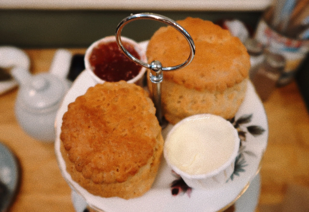 애프터눈티세트 2인을 주문하니 이렇게 3단으로 구성된 트레이와 두 개의 티팟이 나왔다. 티(tea)는 각자 취향에 맞게 목록 안에서 선택할 수 있으며, 가게 방침에 따르면 리필은 불가능하다. 나중에 차가 너무 진해져 뜨거운 물을 요청했는데 리필은 안 된다고 딱 잘라 거절하더라.