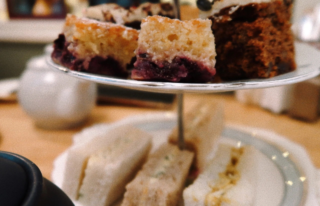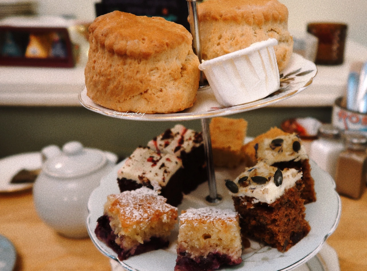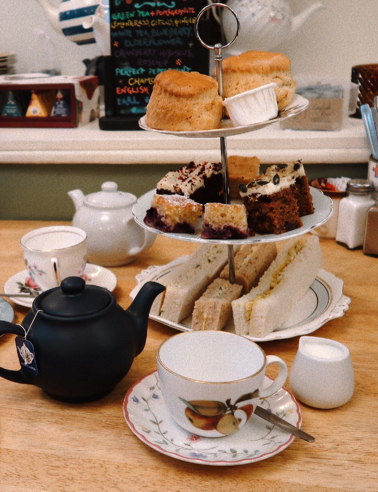 맨 위층에는 스콘 두 개와 클로티드크림, 잼이 놓여있고, 중간층에는 네 종류의 케이크가 각각 두 조각씩 놓여 있었으며, 맨 아래층에는 두 종류의 샌드위치가 역시 또한 두 조각씩 있었다.