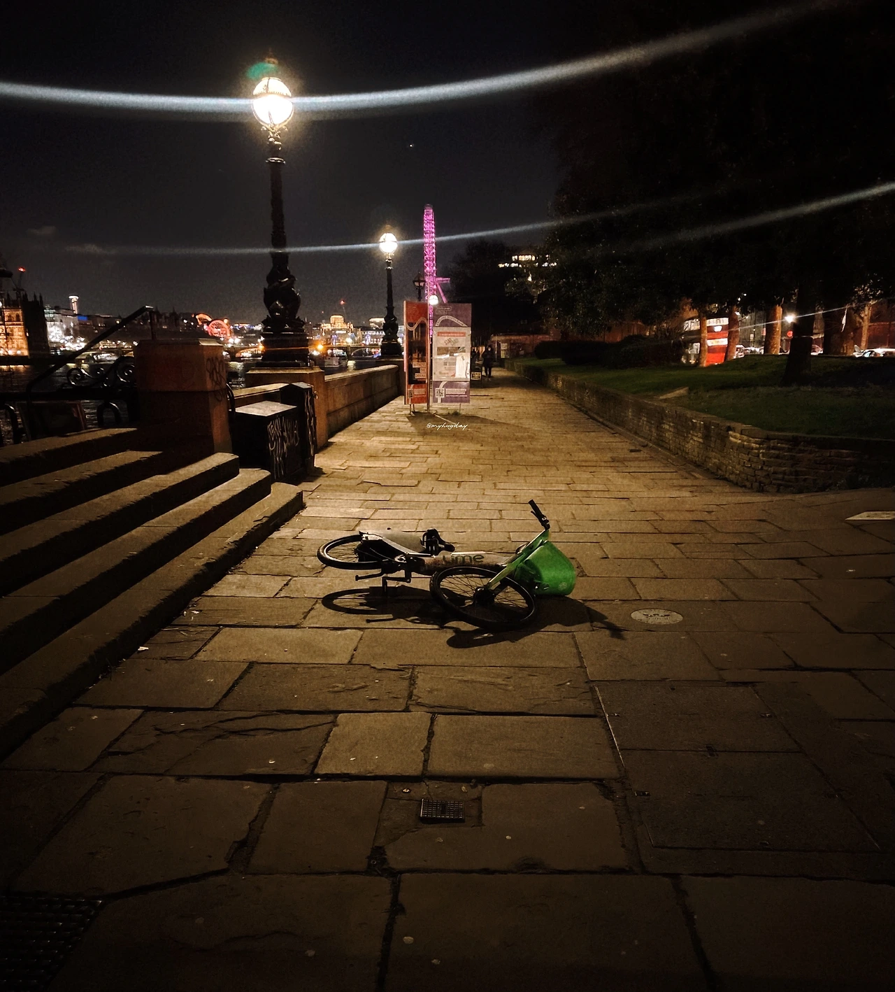 강변 보도 한가운데에 누가 공유 자전거 한 대를 뉘어 내팽개쳐 놓았는데 그 모습이 처량하기도 하고 웃기기도 하여 킥킥대며 사진을 찍었다. 외딴곳에 뜬금없이 홀로 누워있는 것이 꼭 내 처지 같기도 해서 이름도 모르는 자전거에게 괜히 동병상련을 느꼈다.