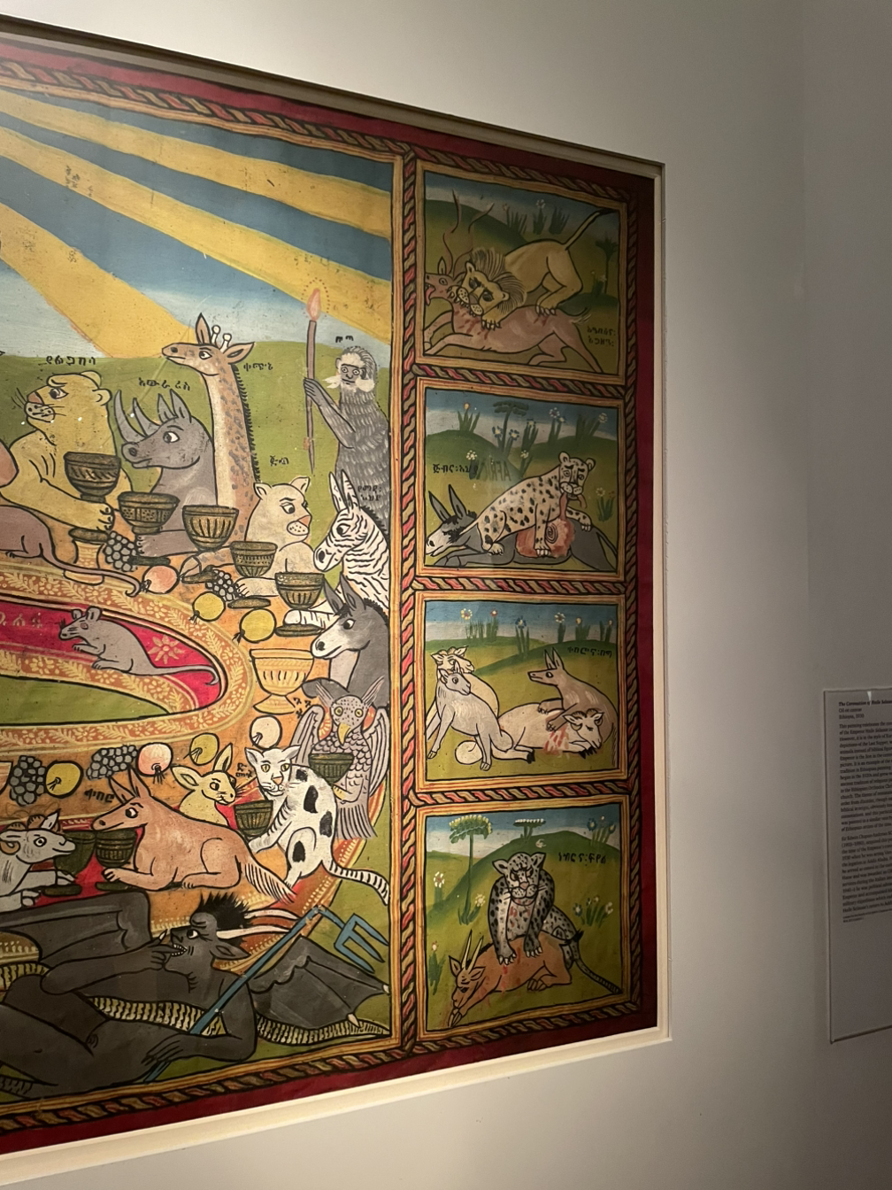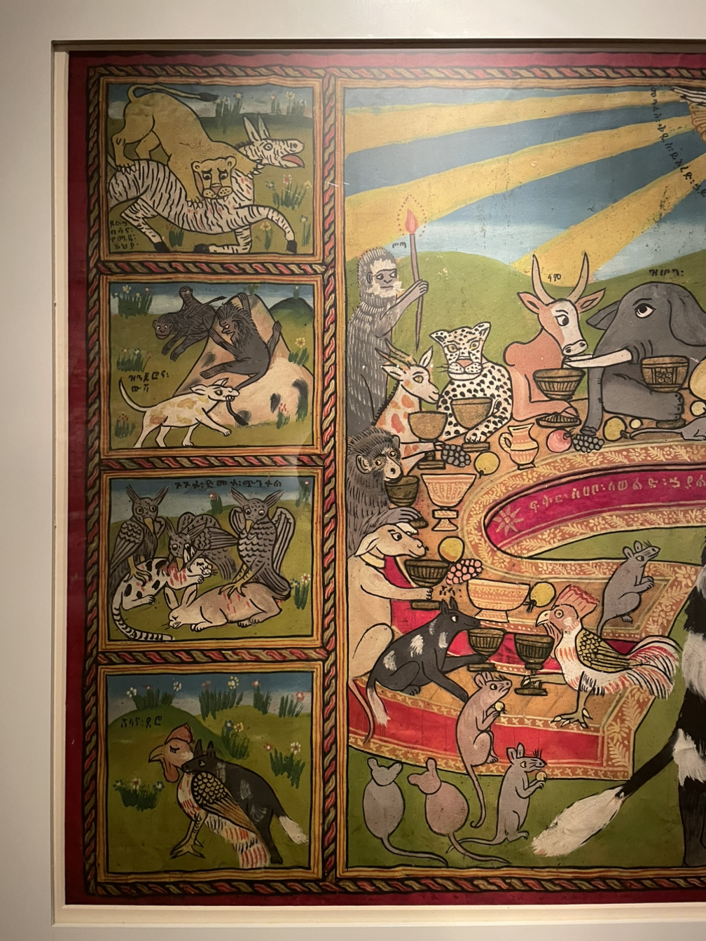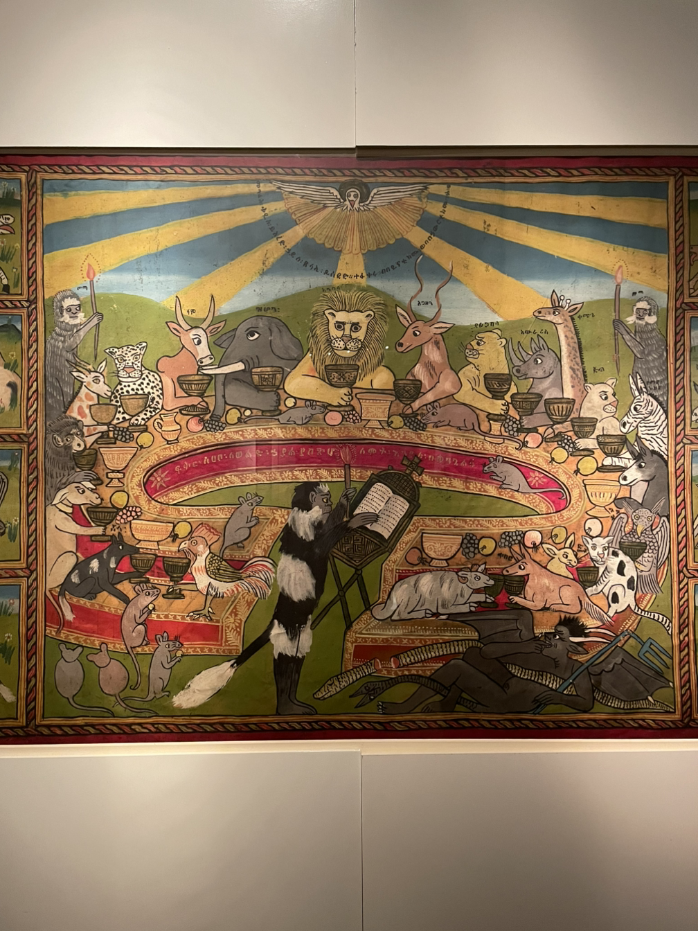 이 작품은 전시관 초입에 놓여 있기도 했고 첫인상이 강렬하여 가장 인상깊게 기억에 남았는데, 동화 삽화 같기도 한 것이 워낙 재치있는 그림이라 조금 더 현대에 가까운 시기에 그려졌을 거라고 예상했는데 1930년 작품이란다. 옆에 놓여있던 설명문에 의하면, 이 그림은 Haile Selassie 황제의 즉위식을 기념하는 작품으로, <최후의 만찬>을 패러디하는 방식으로 그려졌다. 성경 속 인물들 대신 동물들을 그려 넣었는데 여기서 황제는 가운데의 사자로 표현됐다. 당시 이러한 화풍은 에티오피아 예술가들에게서 쉽게 발견되었다고 하니 현대인인 나에게나 재미있지 그 사람들에게 있어 특별한 그림은 아니었겠구나 싶기도 하다.