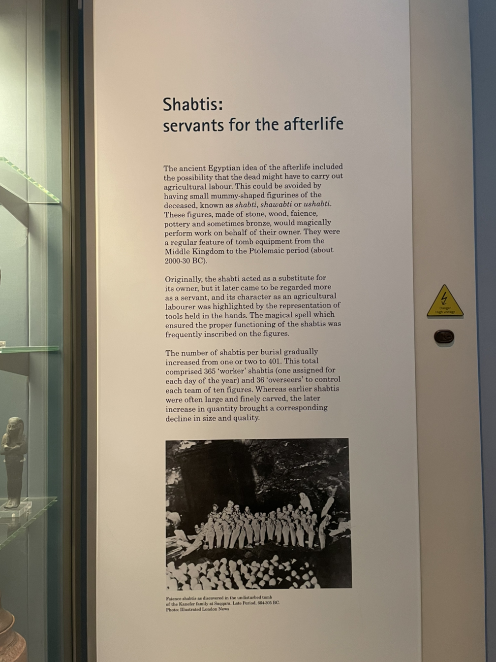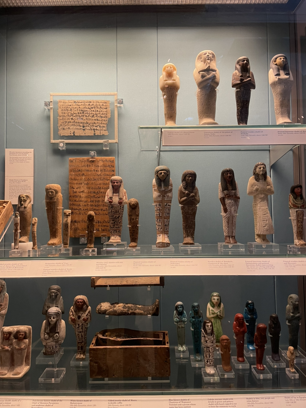가운데 사진에서는 Shabti에 대한 설명이 제시되어 있는데 이전에 일하던 어학원에서 학생들과 함께 원서에서 Shabti와 파라오에 관련된 이야기를 읽었던 기억이 떠올라 더욱 흥미를 갖고 살펴 보았다. Shabti는 고대 이집트에서 죽은 사람을 대신해 사후세계에서 노동을 하도록 만들어진 인형인데, 시간이 지남에 따라 점점 주인의 하인으로 여겨졌다고 한다. 초기의 Shabti등은 크고 정교하게 조각되었지만 시간이 지나면서 함께 묻히는 Shabti의 수는 점점 증가했고 이에 따라 크기와 품질 또한 감소했단다.