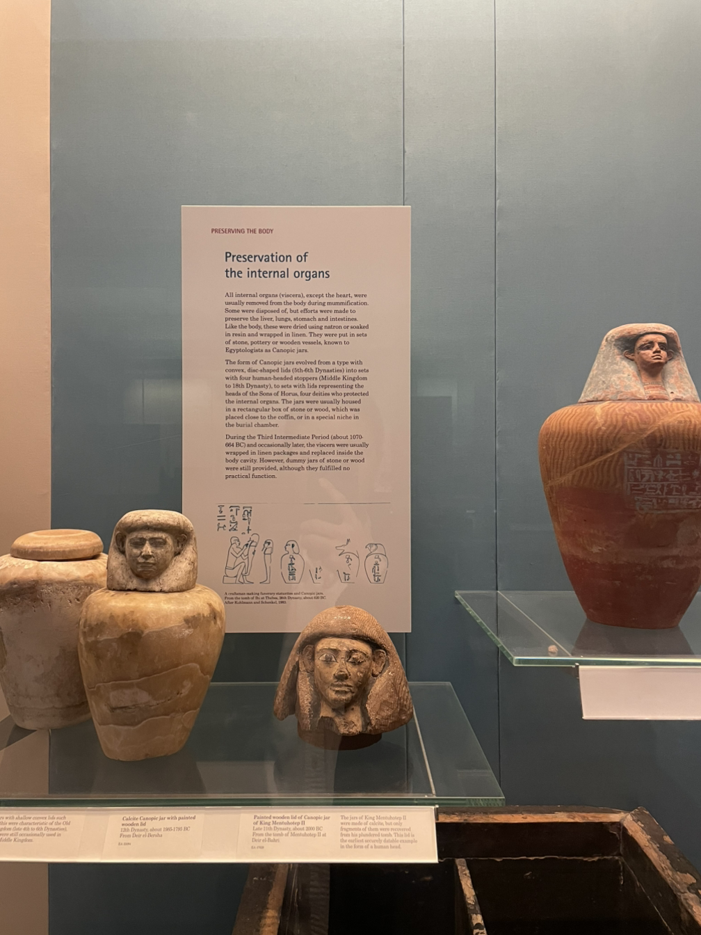 첫번째 사진에서는 사람 머리가 얹어진 항아리들을 볼 수 있는데 이것들은 Canopic jars(카노픽 항아리)로, 고대 이집트의 미라 제작 과정 중 몸에서 제거된 간, 폐, 위, 장 등의 내장들을 건조 및 보존 작업을 거쳐 린넨으로 감싸 이 항아리 안에 보관했다고 한다. 이 항아리는 처음에는 둥근 디스크 모양의 뚜껑이 있었으나 나중에는 사람 머리 모양의 뚜껑으로 발전했다고 한다. 이 항아리들은 상자 안에 넣어져 무덤이나 장례실 안에 놓였는데 제3중기 이후부터는 내장들을 린넨으로 싼 뒤 다시 몸 안에 넣기 시작하여 더이상 이 항아리는 필요가 없게 됐지만 의례용으로 계속해서 제공되었다고 한다.