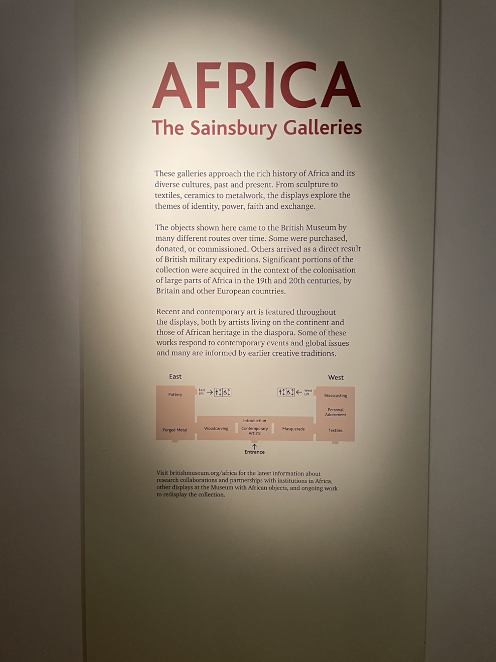 그 후, 아프리카 전시관으로 넘어왔다. 이 전시관은 아프리카의 역사와 문화, 정체성, 권력, 신앙, 교류에 대해서 다루고 있음을 이야기하며, 또한 작품들의 출처에 대해서도 언급하고 있다.