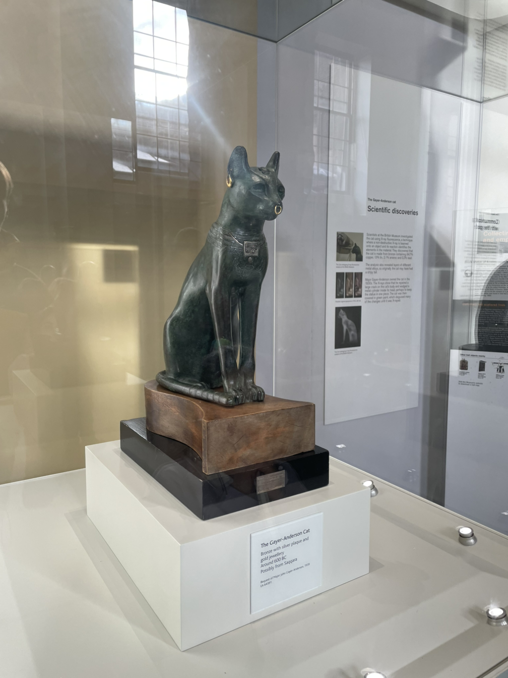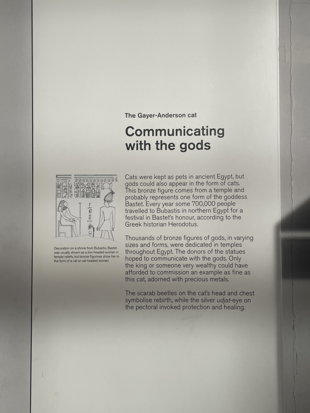 이 귀여운 고양이 조각상은 신과의 소통 매개체 역할을 했던 Gayer-Anderson cat으로, Bastet(바스테트: 이집트 신화에서 가정과 다산, 보호를 담당하던 고양이 머리를 한 여신)의 형태를 띄고 있다. 이런 정교한 조각상을 제작 및 헌납하려면 기부자의 신분은 매우 높았을 것으로 추정되며, 기부자는 이를 바스테트 신에게 바침으로서 신과 소통하고자 했단다.