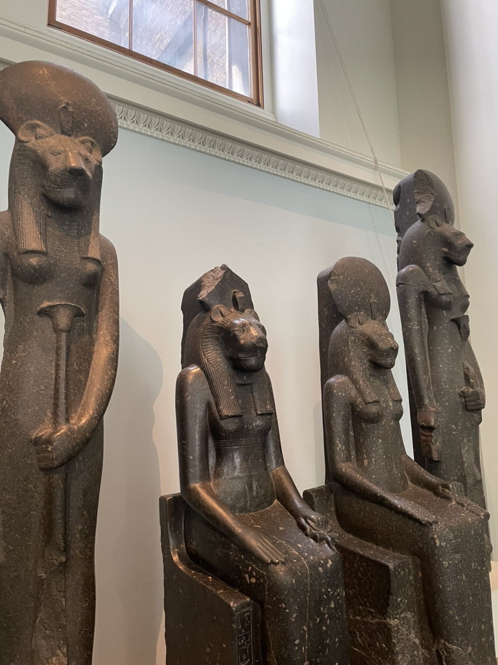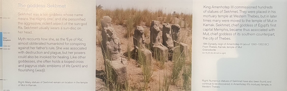 사자의 머리를 한 이 조각상들은 고대 이집트의 여신 Sekhmet(세크메트)이며, The Mighty One(강력한 자)이라는 뜻이라고 한다. 태양신 Ra(라)의 공격적이고 폭력적인 면을 상징하며 태양 원반을 머리에 쓰고 있었다고 한다. 파괴와 전염병의 신이었지만 그와 동시에 치유의 능력도 있었다고 전해진단다. 세크메트는 다른 여신들처럼 생명의 상징 ankh와 번영의 상징인 파피루스 줄기를 들고 있는 경우가 많다고 한다.
