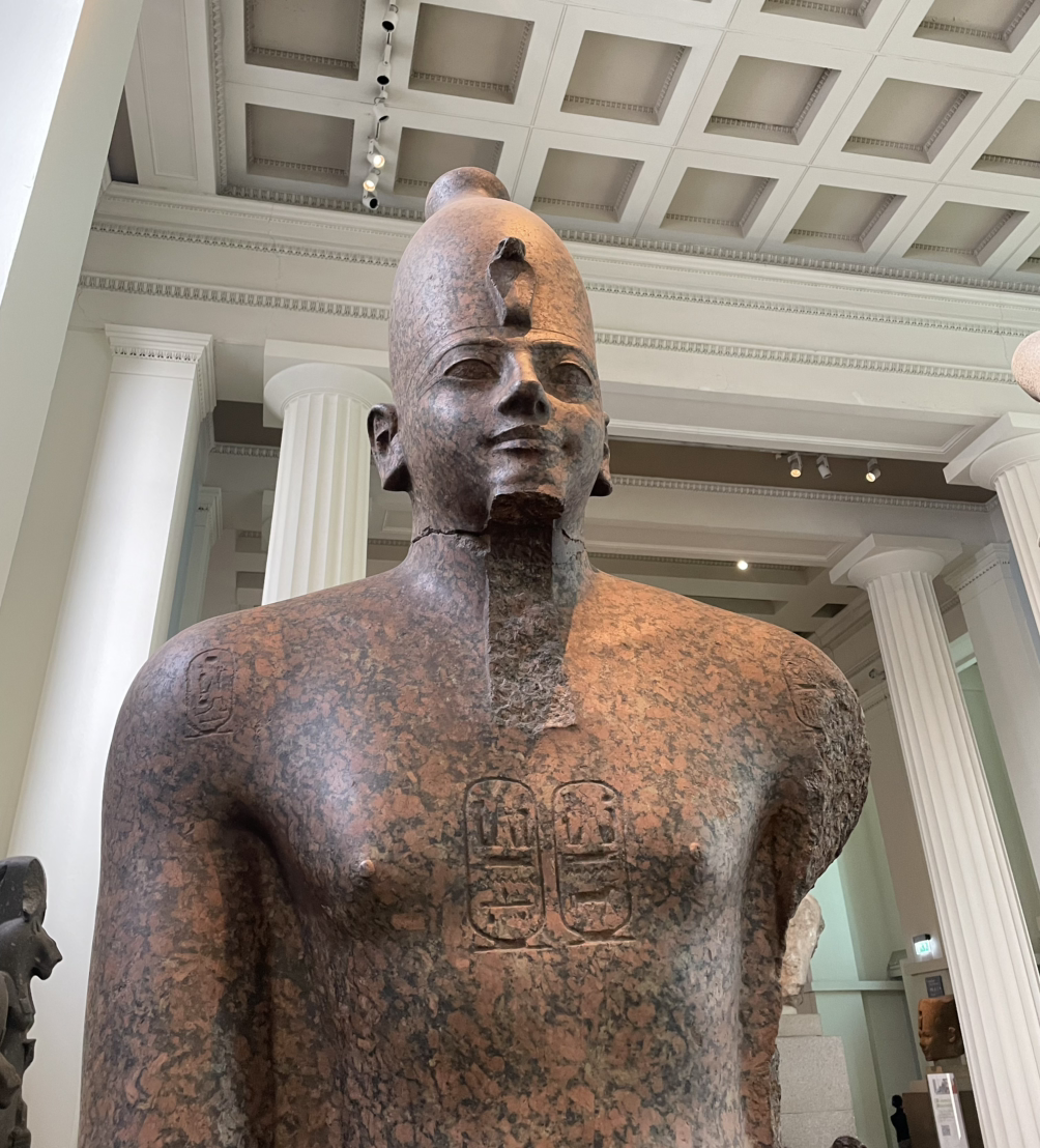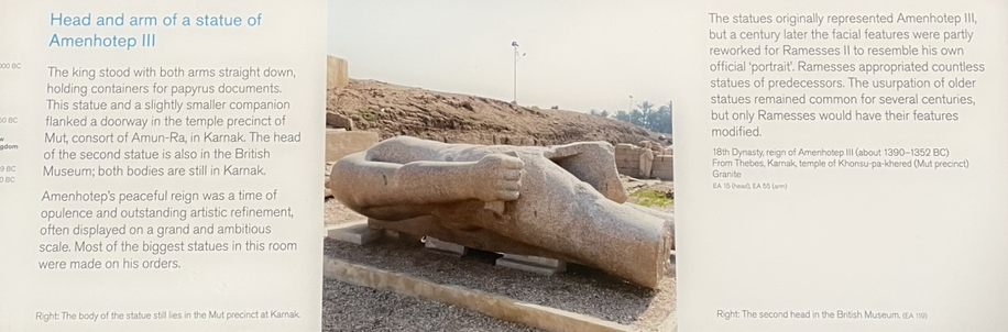 사진으로 보니 미니어처 같아 보이지만 실제로는 엄청나게 커다란 이 조각상의 주인공은 Amenhotep(아멘호텝) 3세라고 한다. 설명에 따르면, 현재 대영박물관에서 이처럼 머리와 한 쪽 팔만을 소장 중인 이 조각상은 본래 Karnak의 Mut 신전 입구에 세워져 있던 것이며, 그가 통치하던 시기는 평화와 번영의 시기였어서 이처럼 대규모의 화려한 예술품들을 많이 만들었다고 한다. 흥미로운 사실은, Amenhotep 3세 후 약 100년, Ramesses(람세스) 2세가 조각상의 얼굴을 자신의 얼굴처럼 약간 수정하여 자기 것인 양 삼았다는 것이다. 설명에 의하면 Ramesses 2세는 이전 왕들의 조각상을 자주 자기 것처럼 바꾸곤 했지만 이처럼 얼굴까지 수정한 일은 드문 사례였다고 한다.