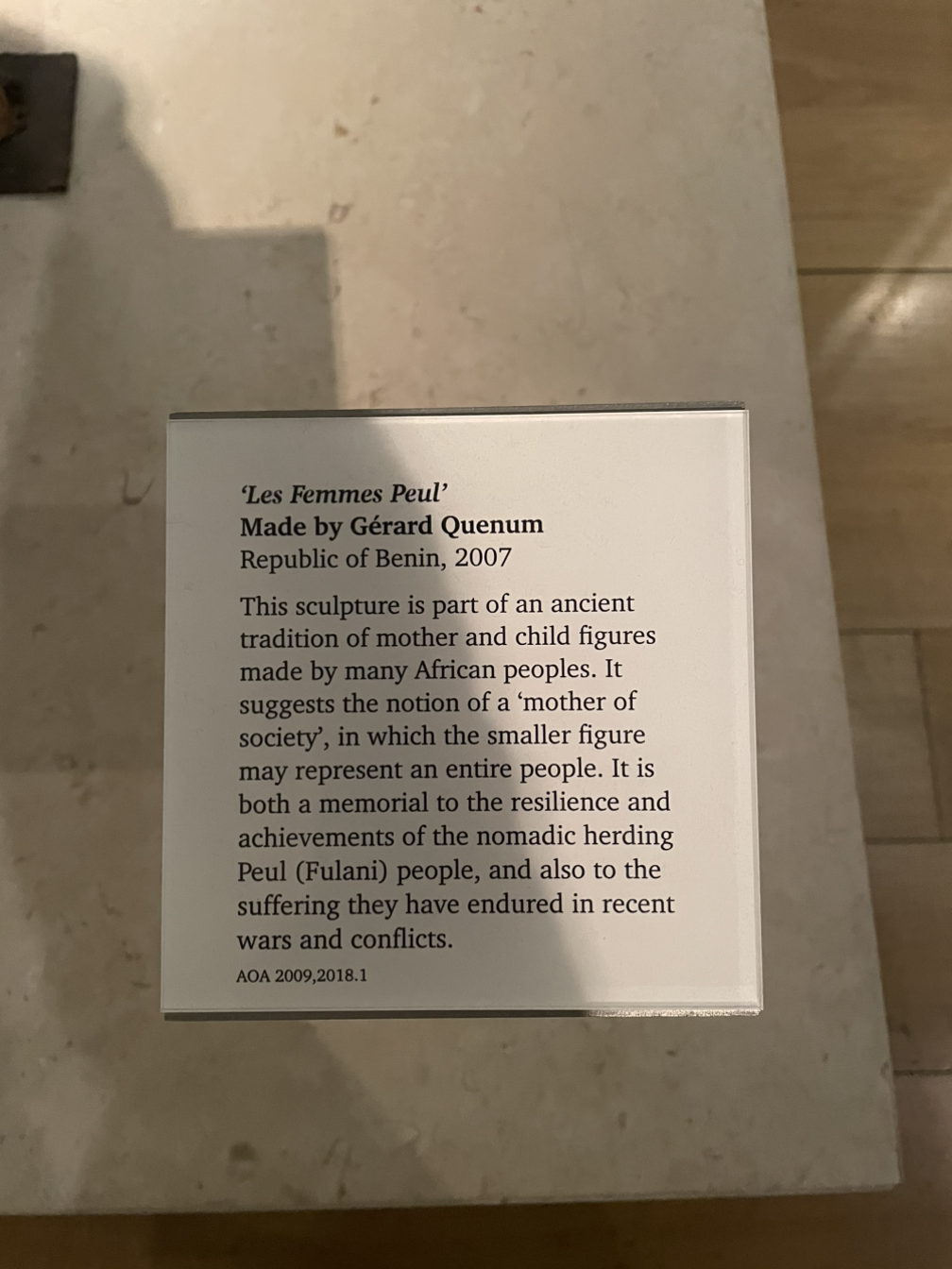이 신비하고도 흥미로운 조각 작품은 어머니와 아이를 형상화한 조각으로, 아프리카에서 전통적으로 다뤄져오던 형태의 주제를 이어간 것이라고 한다. 특히 이 작품은 Fulani라는 유목민 집단의 회복력과 성취를 기리기 위한 기념물일 뿐만 아니라 그와 동시에 전쟁과 갈등으로 인한 고통 및 고난을 표현하고 있기도 한단다.