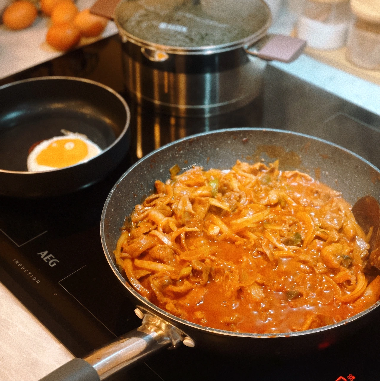 어제는 하얀 맛 아침식사였는데 오늘은 빨간 맛 아침식사로 하루를 연다. 제육볶음에 달걀프라이 조합은 말해 무엇하나, 아주 환상의 콤비다.