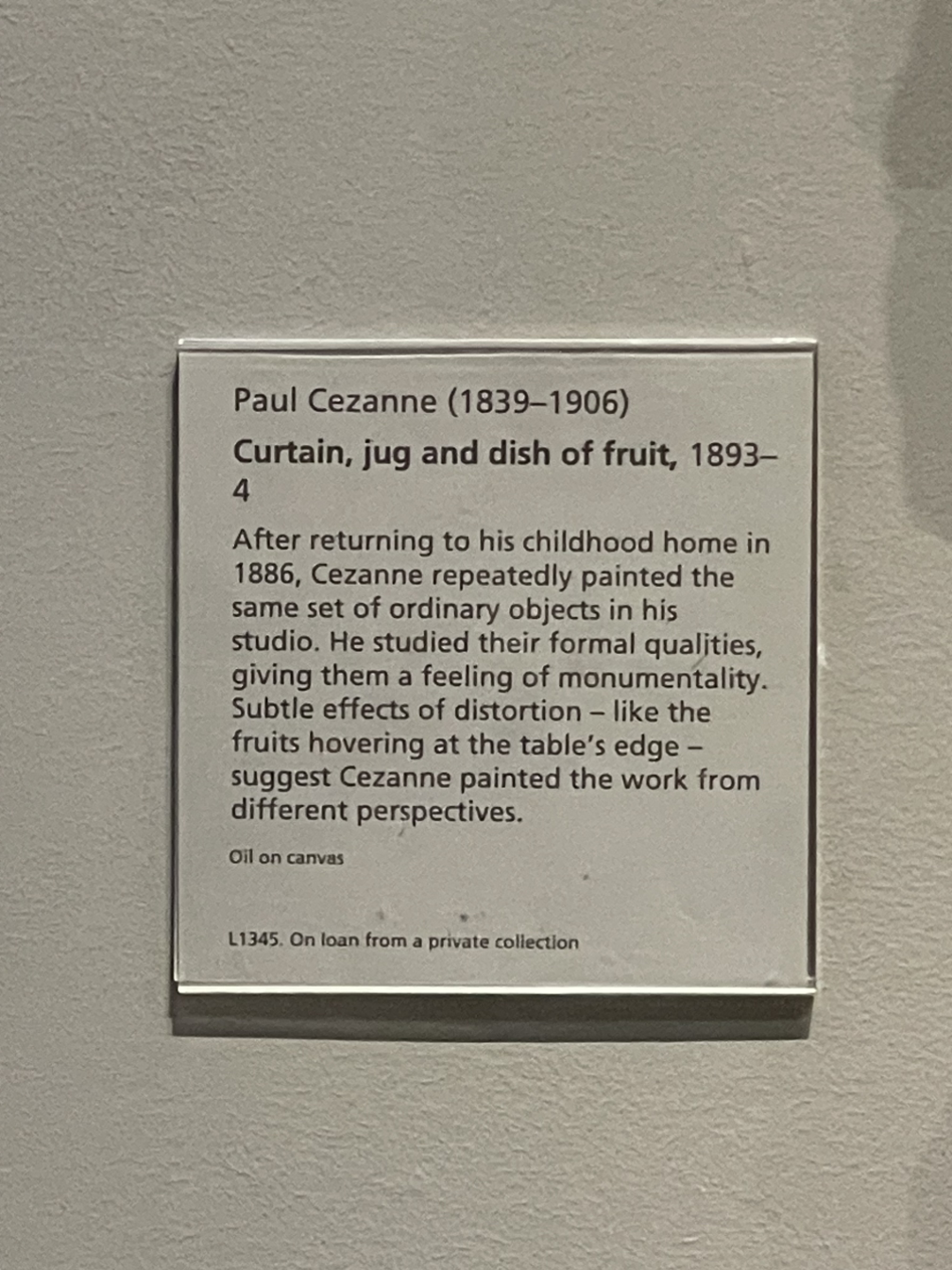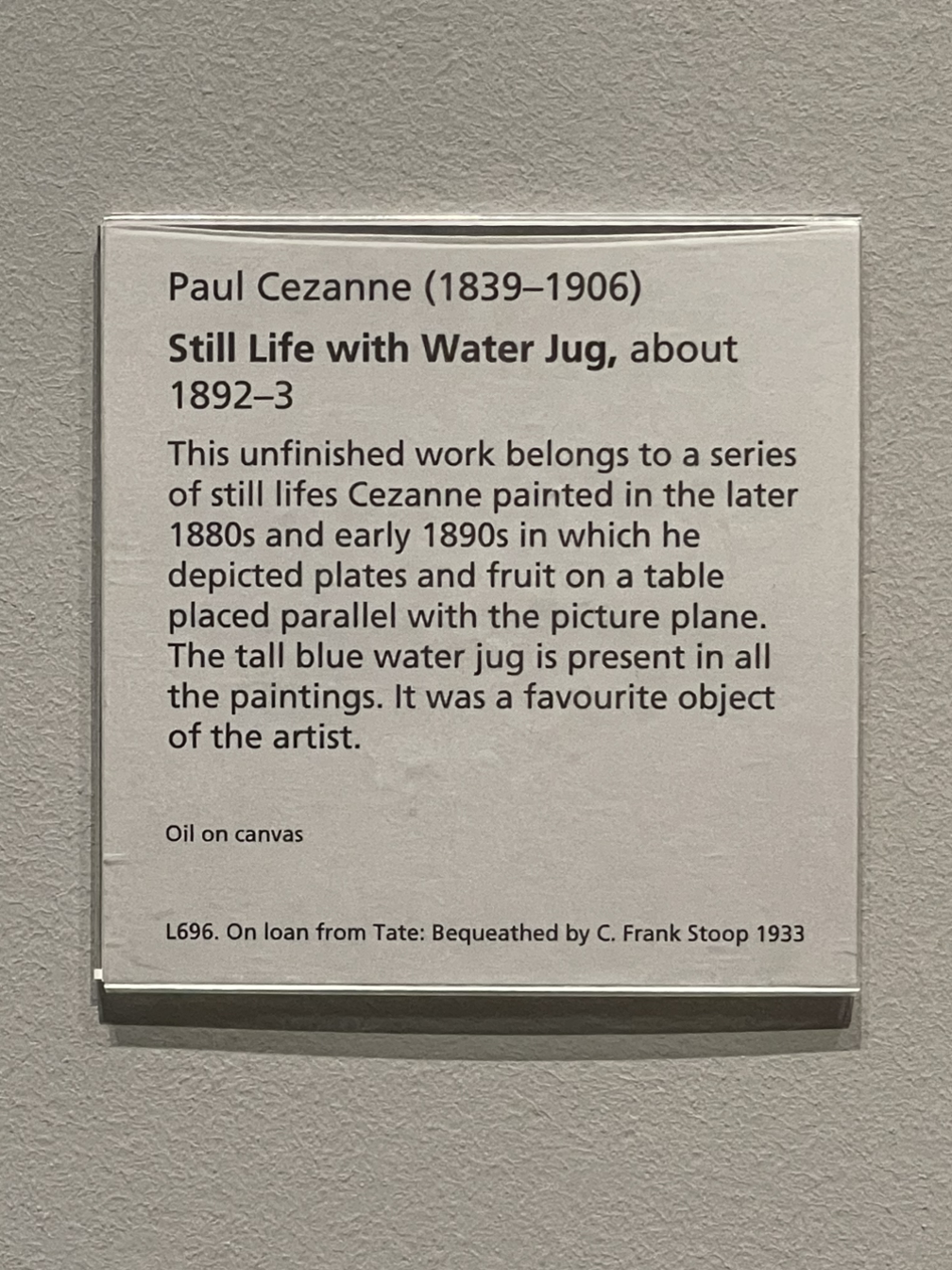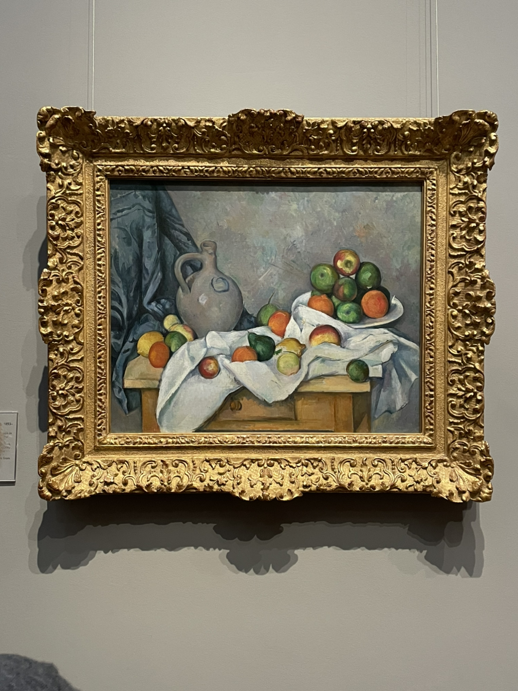 Paul Cezzane(폴 세잔)의 또 다른 작품 <물병이 있는 정물화>. 이 작품은 미완성 작품으로, 세잔만의 독특한 화풍을 잘 보여주는 정물화 시리즈 중 하나다. 안내문에 의하면 그림 속 긴 파란색 물병은 화가가 가장 좋아하던 오브젝트라고 한다.