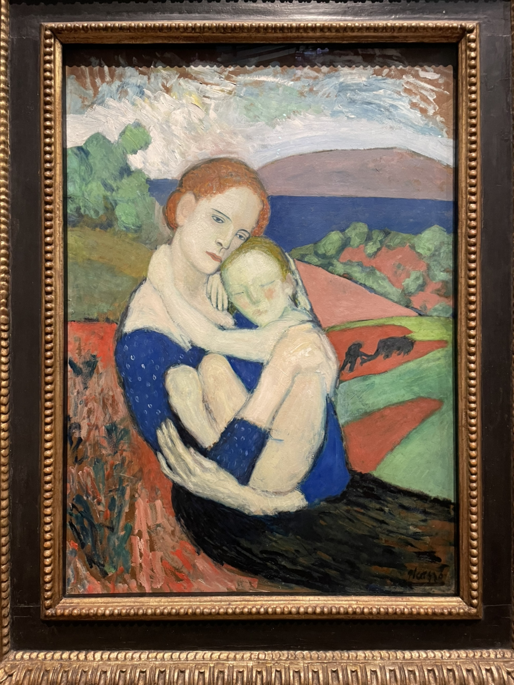 이 작품은 Pablo Picasso(파블로 피카소)의 <모성애>라는 작품으로, 그의 우울했던 청색시대를 대표하는 작품이라고 할 수 있다. 이 시기의 피카소는 친구의 죽음으로 인한 영향으로 청록색 계열의 다양한 색조를 사용하여 우울한 주제를 다뤘다고 한다. 이 작품 속의 어머니는 아들을 부드럽게 껴안으며 따뜻한 모성애를 드러내고 있다. 보고 있으니 왜인지 위로를 받는 기분이다.